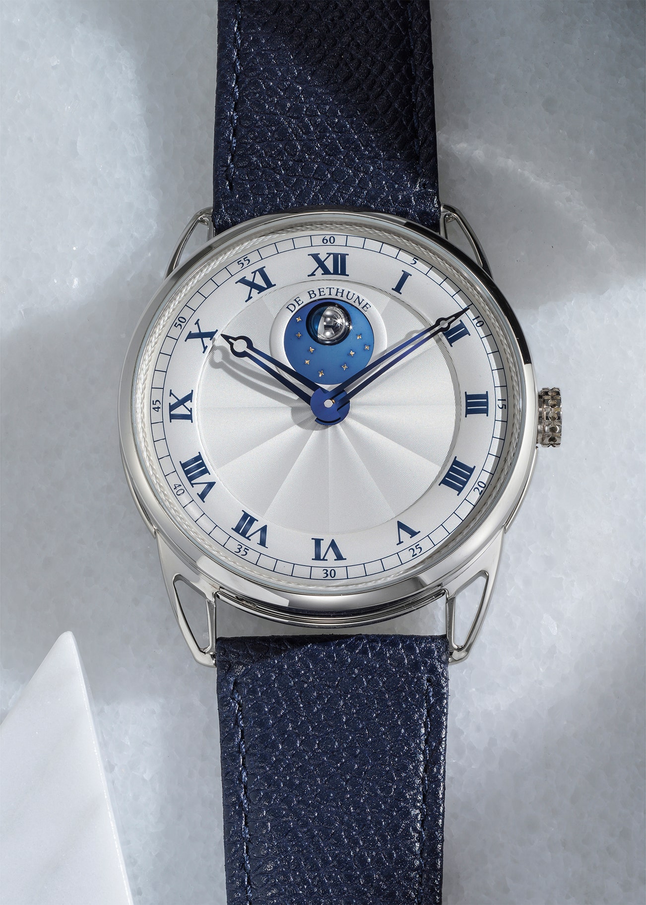 - Featuring the immediately recognisable hand guilloché silver dial, now a signature of De Bethune timepieces, the dial is further adorned by a three dimensional spherical moon phase display, made of titanium and platinum and accurate up to 122 years.