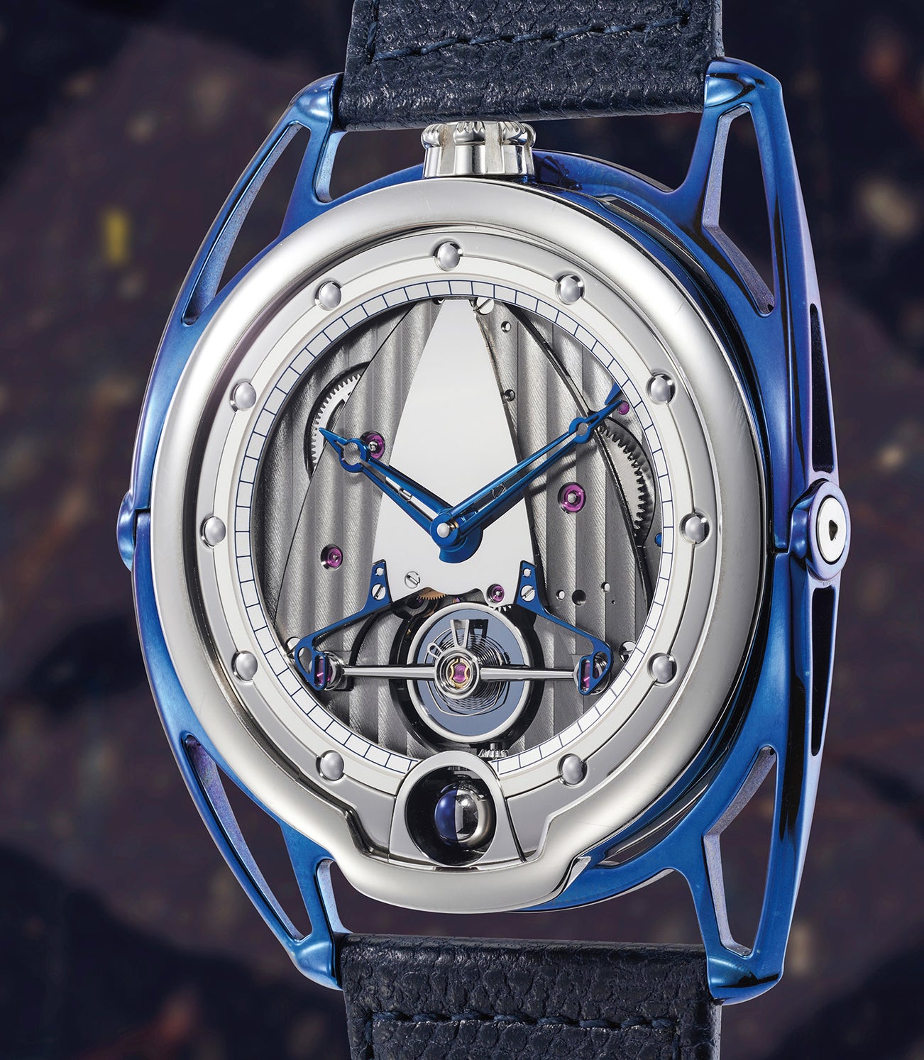 A very fine and attractive two tone blue polished grade 5 titanium and titanium semi-skeletonized wristwatch with 3D moon phases, power reserve indication, floating lugs, certificate and presentation box