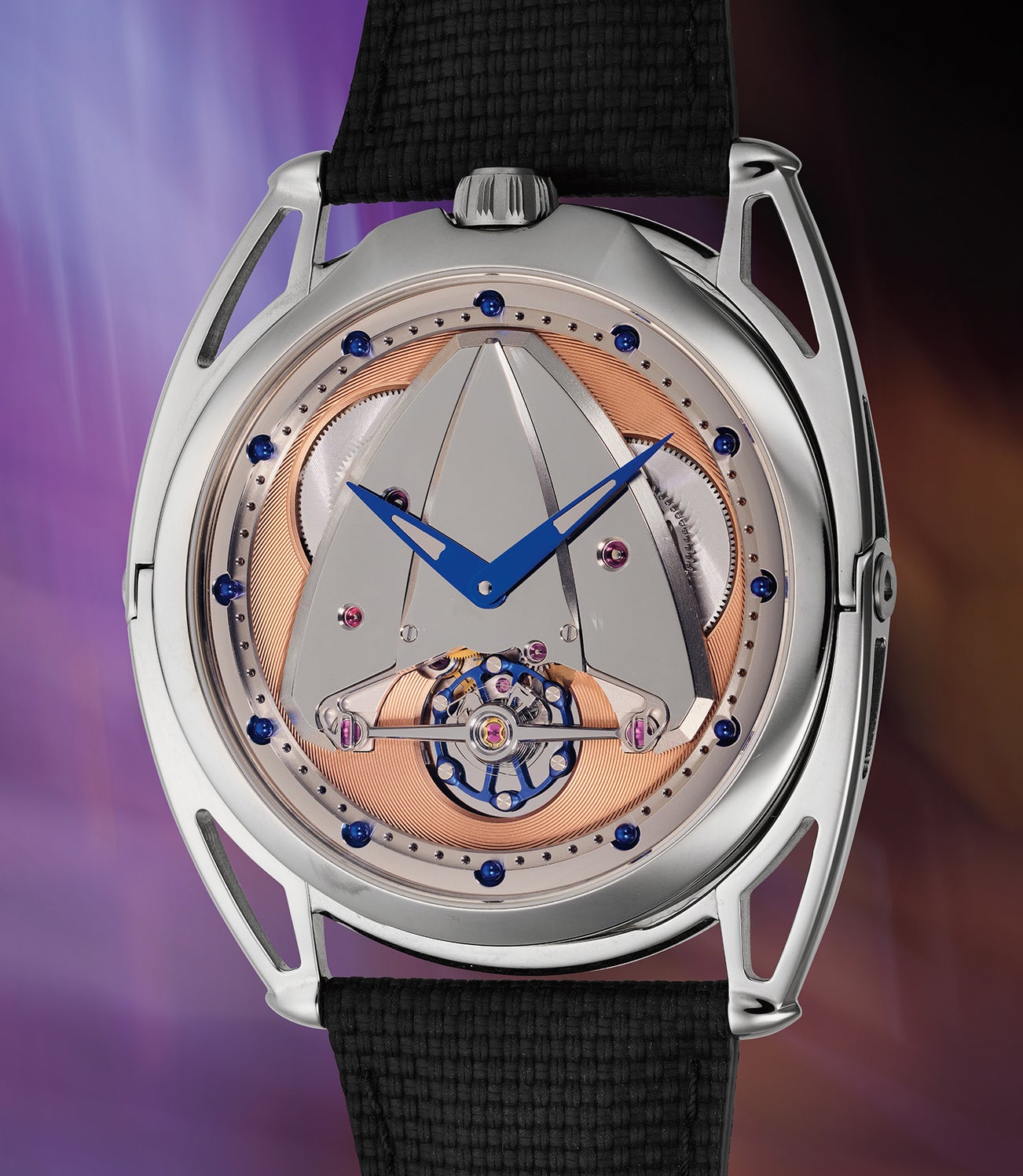 An avant-garde and highly exclusive limited edition titanium wristwatch with exposed balance wheel, “microlight rose” dial, and articulating lugs, numbered '01'