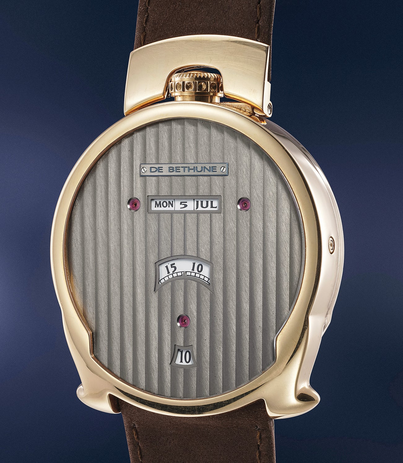 Independent watchmaker De Bethune is renowned for its daring aesthetics combined with high-end traditional watchmaking techniques. The present piece perfectly exemplifies this vocation: the time is indicated in digital fashion, with the minutes displayed on a disc and a window for the jump hours. The calendar follow suit, adopting a linear display at 12.