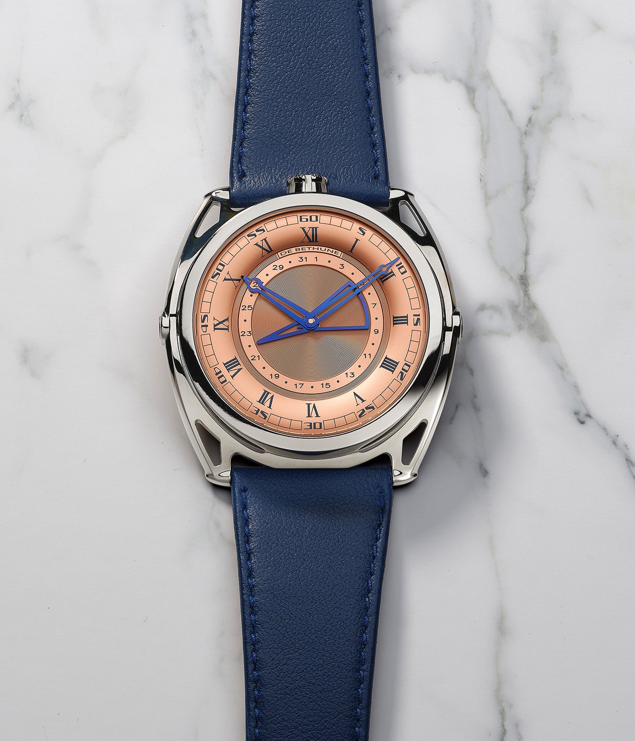 The present DB 27 in titanium is a sight to behold with its polished titanium case, beautiful salmon dial and blue accents giving the watch incredible charisma. The 3 dimensional architecture of the dial with its brushed and polished surfaces and concentric circles (which the brand calls microlight engraving) literally give life to the dial. The spring loaded floating lug system of the case enables the watch to adapt to the wrist for ease of wear.