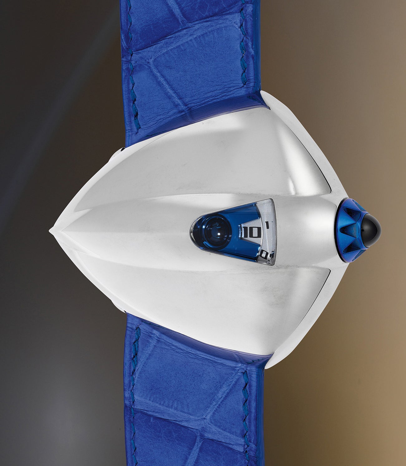 The Dream Watch 5 looks like it could be an alien object or spacecraft straight out of Star Trek or Star Wars. The deltoid-shaped titanium case is completely mirror-polished, and the only indication that it’s some sort of timepiece is a digital read-out for jumping hours and wandering minutes. On one side of this digital time display is a tiny three-dimensional moon-phase that slowly rotates and is accurate to one day every 1,112 years; the other side incorporates a large crown that’s set with an eye-catching ruby cabochon.