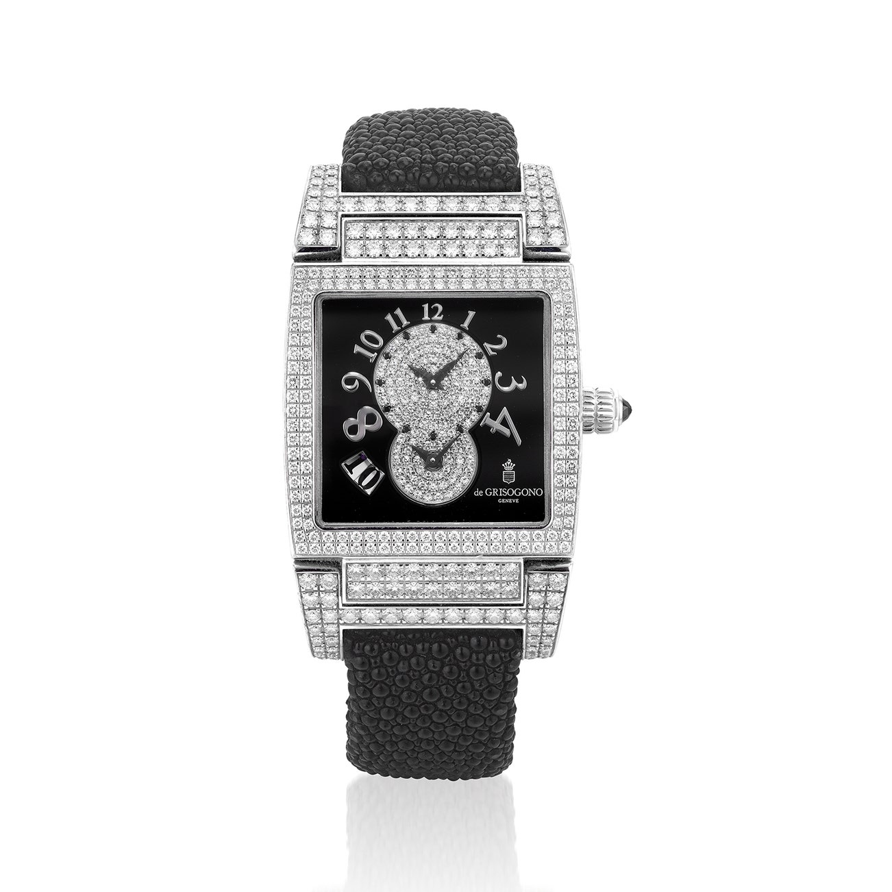 Of automatic movement, diamond-set square case and lugs, black dial decorated with single-cut diamonds, circular-cut black diamond indicators and crown, Arabic numerals, with date aperture between 7 and 8 o'clock, glazed caseback with a De Grisogono stingray strap and diamond-set double folding buckle, mounted in white gold, dial, caseback and buckle signed de Grisogono, numbered, Swiss assay marks, case width approximately 33 mm, inner circumference approximately 170 mm.
