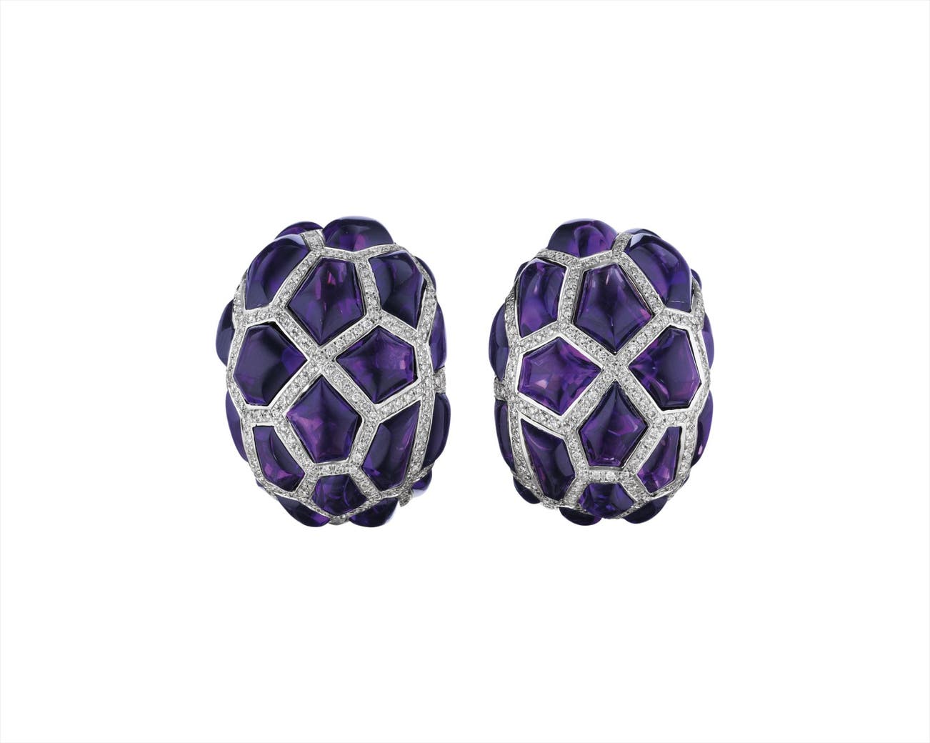 Each designed as a bombé dome, set with geometric shaped cabochon amethyst, enhanced by pavé-set diamonds, mounted in 18K white gold, length 1 1/4 inches.