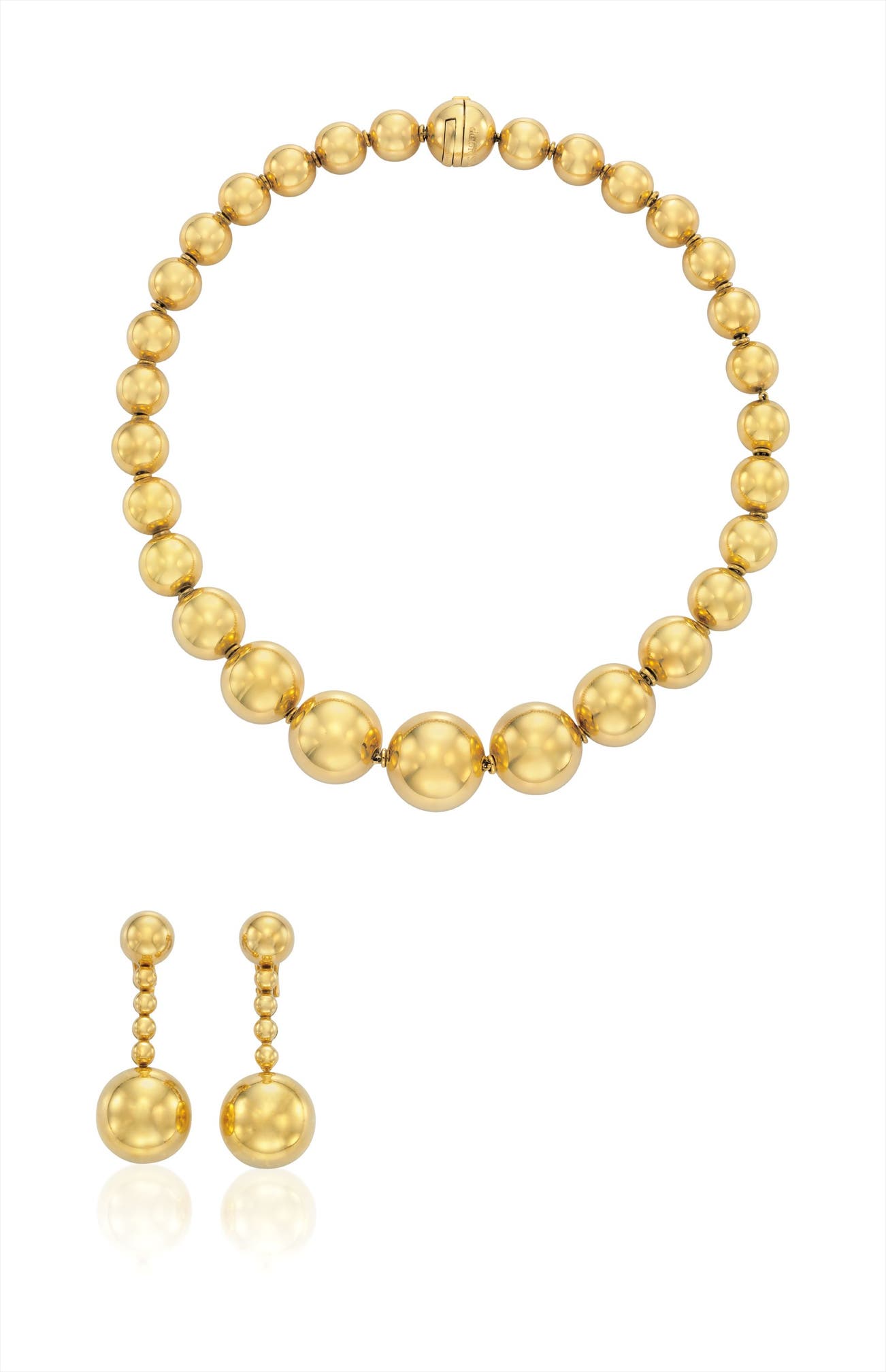 Comprising a necklace designed as a graduated line of polished gold beads; a pair of ear pendants en suite, mounted in 18K yellow gold, necklace length 17 1/2 inches, ear pendant length 2 inches.