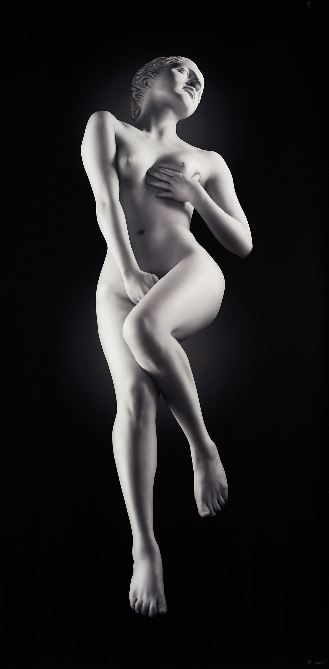 Masturbating Grace by Korean-American mixed media artist and 2009 Sovereign Asian Art Prize winner Debbie Han, hybridises a photographed body of a contemporary Asian women with a classical marble head of a goddess and suggests sexual autonomy, subversively addressing the perception of the idealised female. Achieving the marble-like skin texture and imposing sculptural presence is a meticulous and time-consuming process whereby Han digitally renders the entire skin surface of the figure, pixel by pixel.
