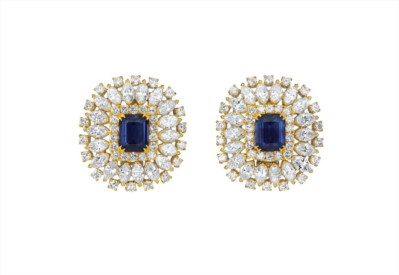 Each centering upon a rectangular-cut sapphire within a circular-cut diamond surround, to the circular and marquise-cut diamond frame, mounted in 18K yellow gold, length 1 1/4 inches.