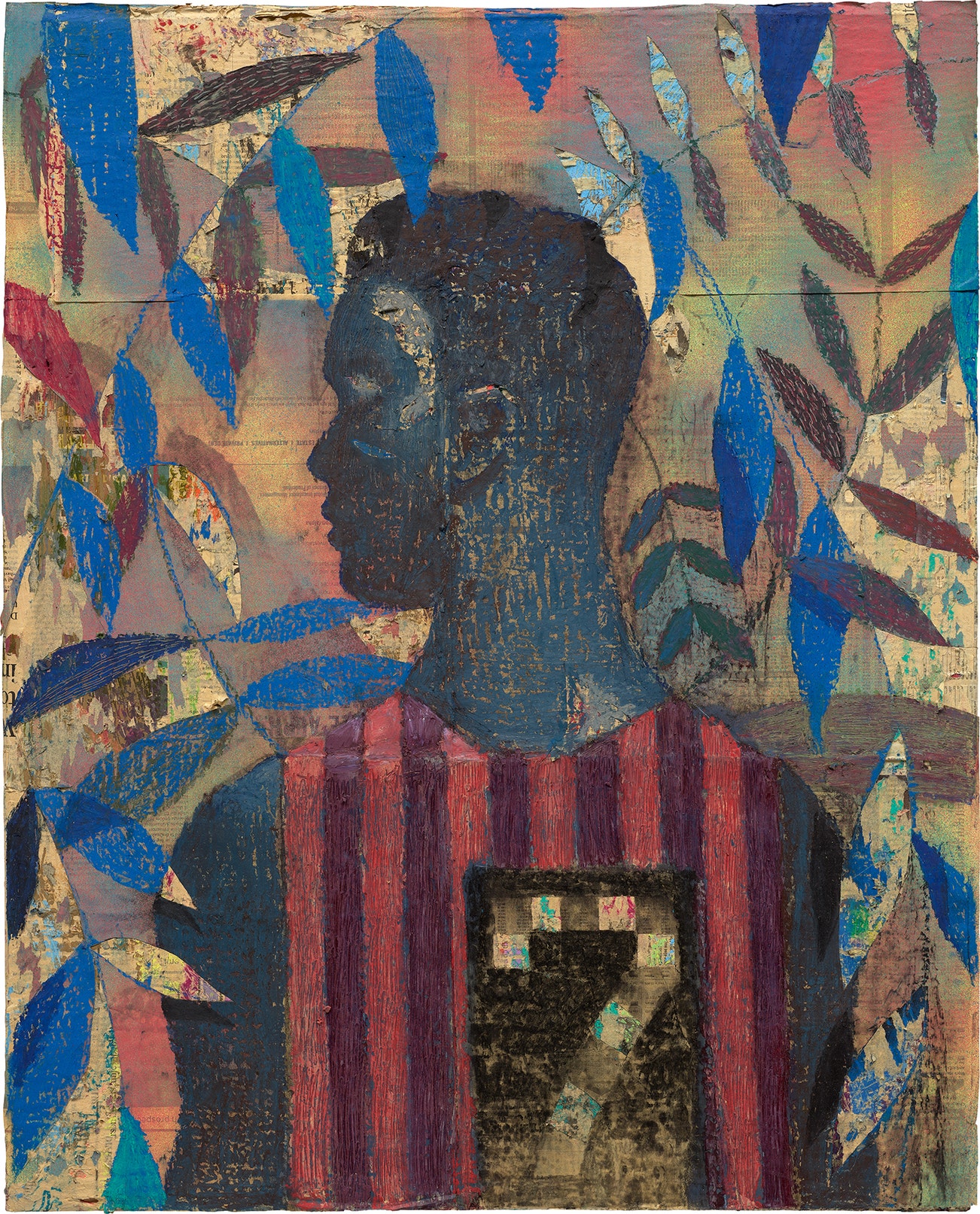 acrylic, charcoal and oil pastel on newspaper mounted to canvas