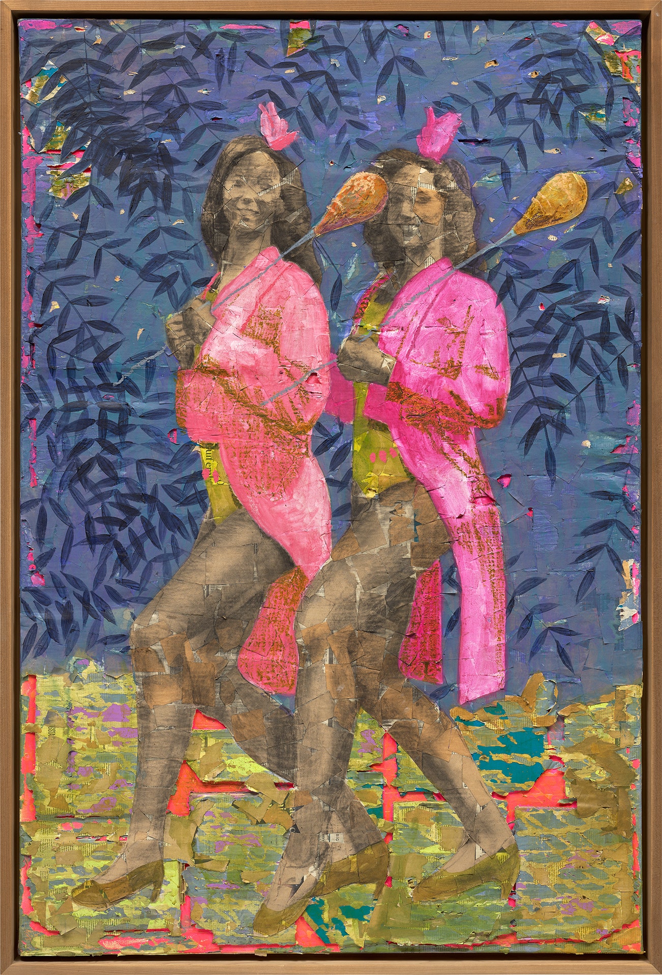 acrylic, charcoal, oil pastel and foil on newspaper mounted on canvas, in artist's frame