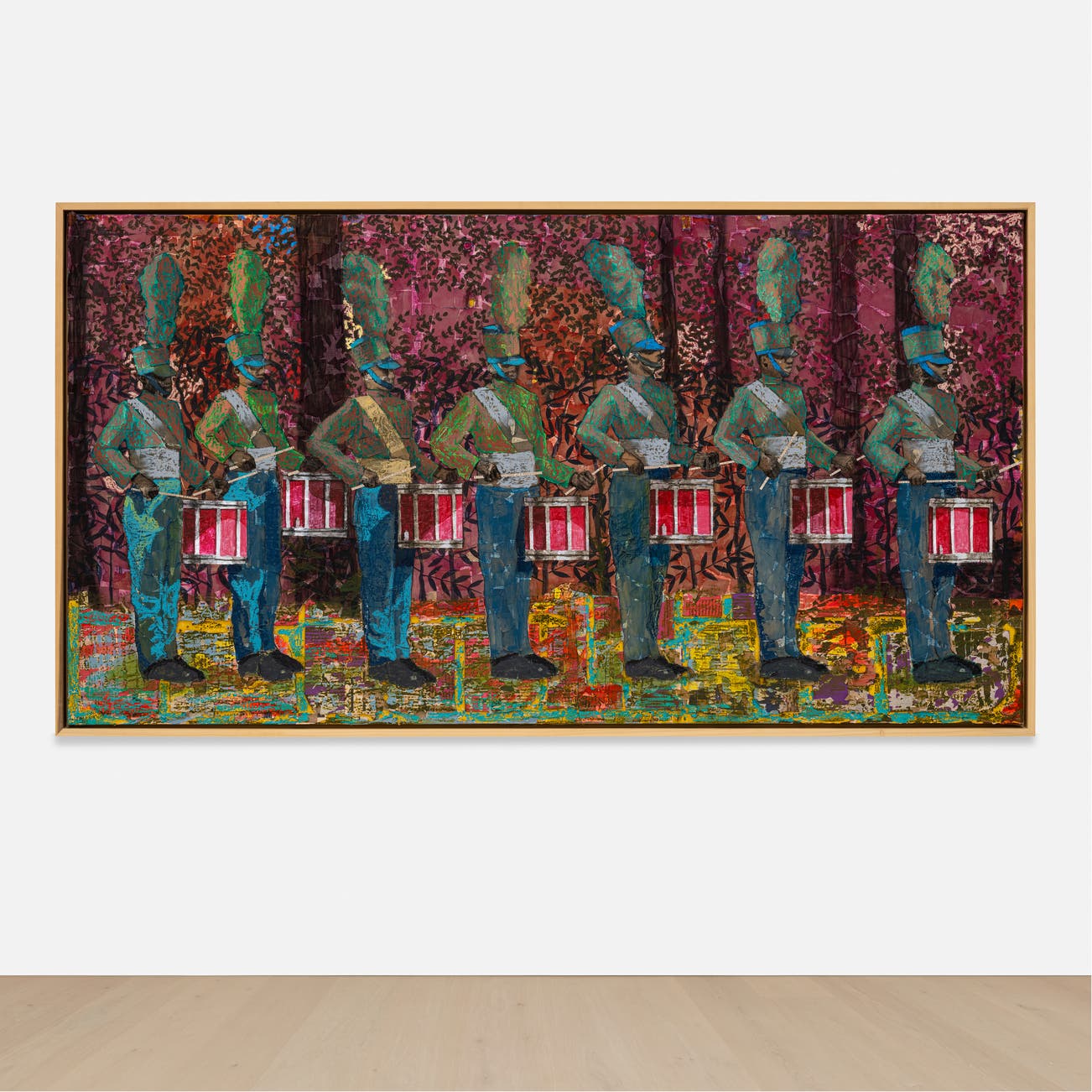acrylic, charcoal, oil pastel and foil on newspaper laid down on canvas, in artist's frame