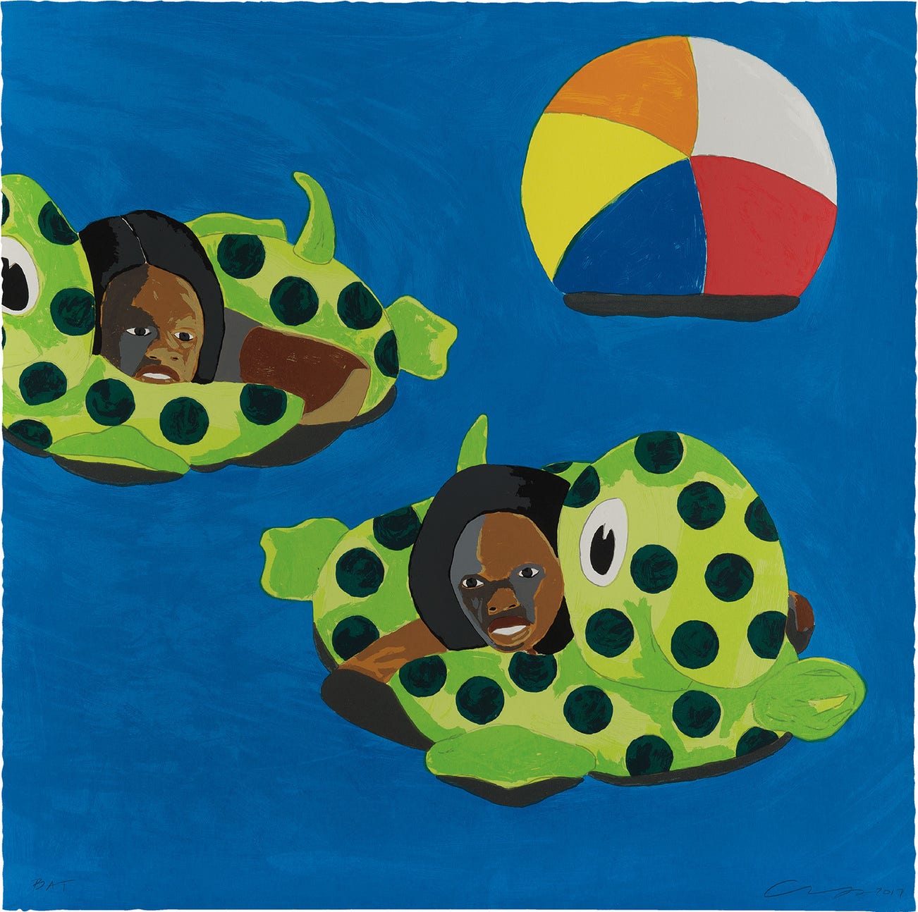 In his collage works mimicking television screens, Adams takes his source imagery from screen captures of old clips from YouTube, which he then uses as reference. “The images come from…everything from ‘Good Times’ to ‘Coming to America’ to Oprah on the news…These images I’m taking from all these shows—from comedy to news or whatever—all are representations of black characterization…These images can be problematic because they’re such a high-animated state that they become more like caricatures of themselves”. In rendering these reference images with blocks of color, Adams confronts the media’s deconstruction of reality.