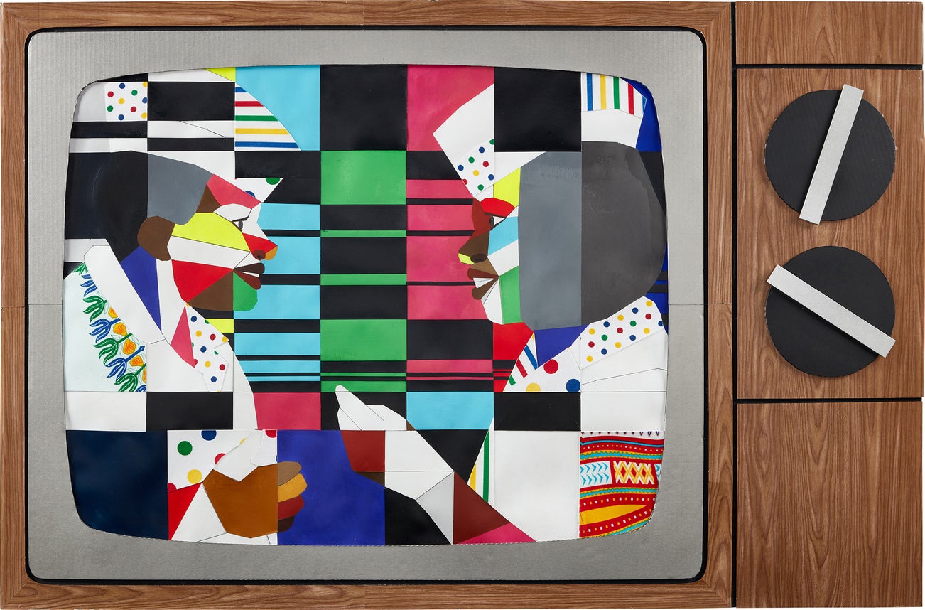 In his collage works mimicking television screens, Adams takes his source imagery from screen captures of old clips from YouTube, which he then uses as reference. “The images come from…everything from ‘Good Times’ to ‘Coming to America’ to Oprah on the news…These images I’m taking from all these shows—from comedy to news or whatever—all are representations of black characterization…These images can be problematic because they’re such a high-animated state that they become more like caricatures of themselves”. In rendering these reference images with blocks of color, Adams confronts the media’s deconstruction of reality.