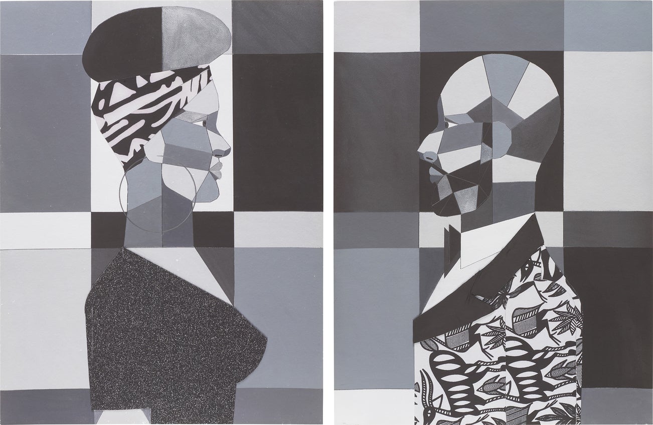 In his collage works mimicking television screens, Adams takes his source imagery from screen captures of old clips from YouTube, which he then uses as reference. “The images come from…everything from ‘Good Times’ to ‘Coming to America’ to Oprah on the news…These images I’m taking from all these shows—from comedy to news or whatever—all are representations of black characterization…These images can be problematic because they’re such a high-animated state that they become more like caricatures of themselves ”. In rendering these reference images with blocks of color, Adams confronts the media’s deconstruction of reality.