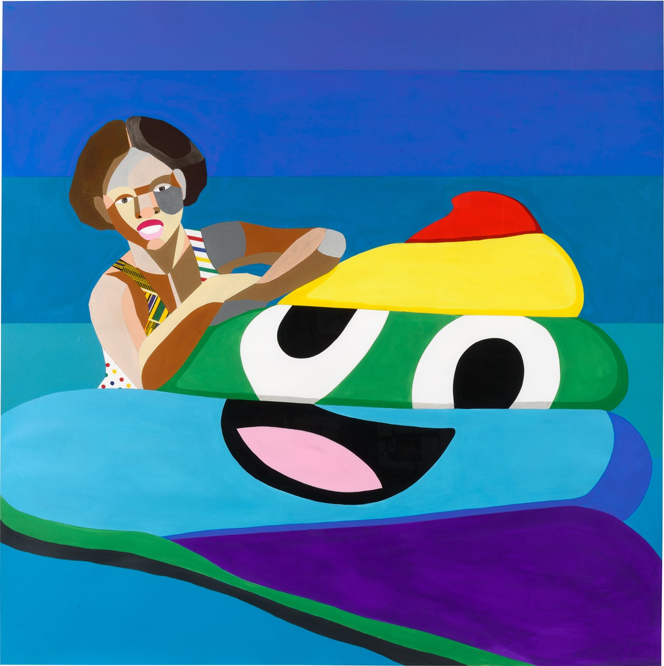 In his collage works mimicking television screens, Adams takes his source imagery from screen captures of old clips from YouTube, which he then uses as reference. “The images come from…everything from ‘Good Times’ to ‘Coming to America’ to Oprah on the news…These images I’m taking from all these shows—from comedy to news or whatever—all are representations of black characterization…These images can be problematic because they’re such a high-animated state that they become more like caricatures of themselves”. In rendering these reference images with blocks of color, Adams confronts the media’s deconstruction of reality.