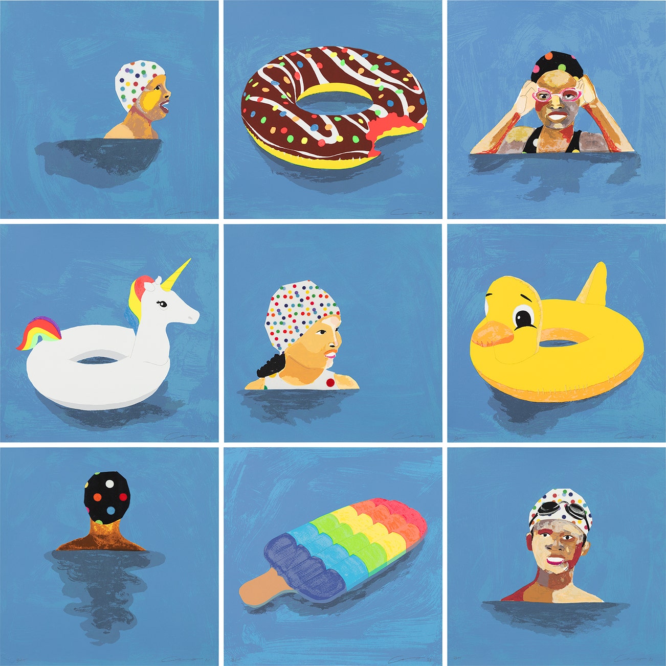 In his collage works mimicking television screens, Adams takes his source imagery from screen captures of old clips from YouTube, which he then uses as reference. “The images come from…everything from ‘Good Times’ to ‘Coming to America’ to Oprah on the news…These images I’m taking from all these shows—from comedy to news or whatever—all are representations of black characterization…These images can be problematic because they’re such a high-animated state that they become more like caricatures of themselves”. In rendering these reference images with blocks of color, Adams confronts the media’s deconstruction of reality.