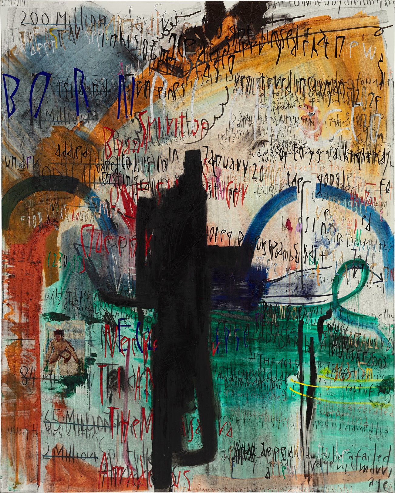oil, spray paint, marker, oil crayon, charcoal, chalk pastel and collage on canvas