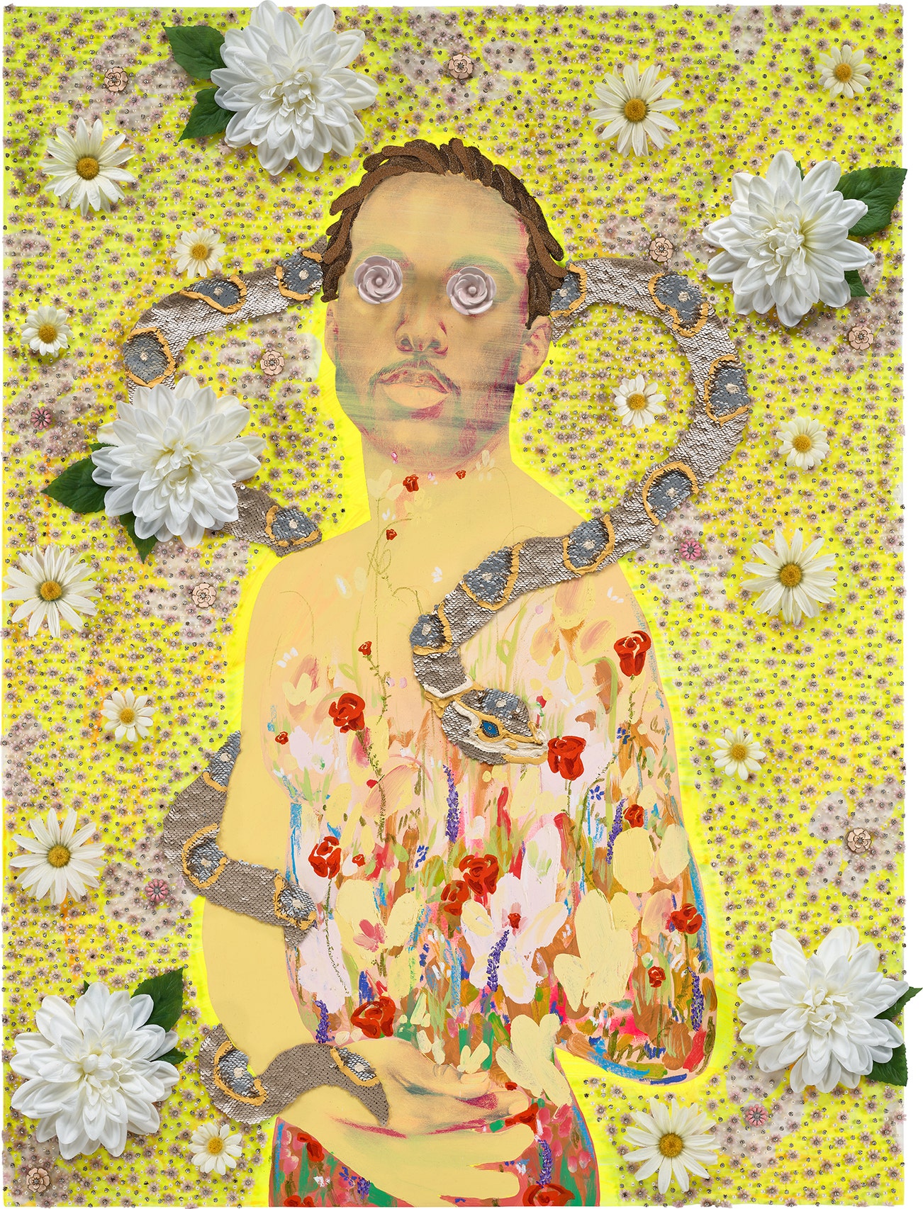 oil, acrylic, beads, fabric, glitter, silk flowers, sequins, colored pencil and found objects on canvas over panel