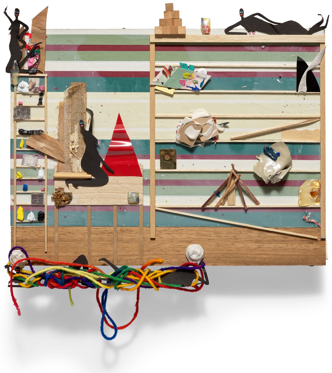 oil, paper, yarn and mixed media on panel