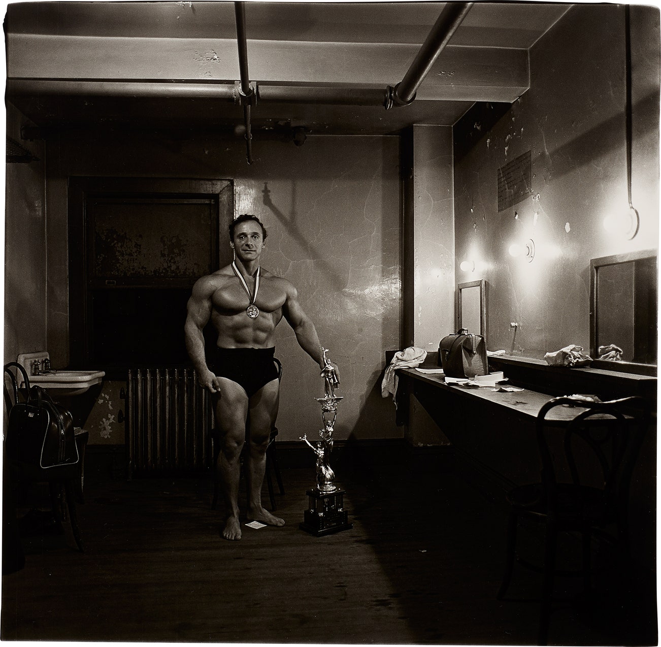 Muscle man in his dressing room with trophy, N.Y.C., 1962