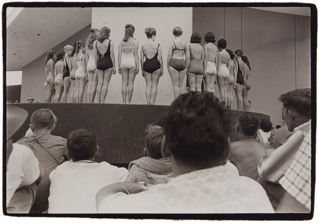 On the cusp of defining her unique aesthetic that would delve into the beautiful oddities of humanity, but still years away from institutional recognition, Arbus turned her lens on the Miss Venice Beach beauty pageant where she photographed as a spectator in the crowd. Instead of focusing exclusively on the females parading across the stage in their bathing suits, Arbus took one step back, taking in the male audience as well as the women themselves, and thereby subtly transforming the subject from the pageant itself to the cultural ritual of such an event; one where women perform and compete for the title as crowds ogle and look on.