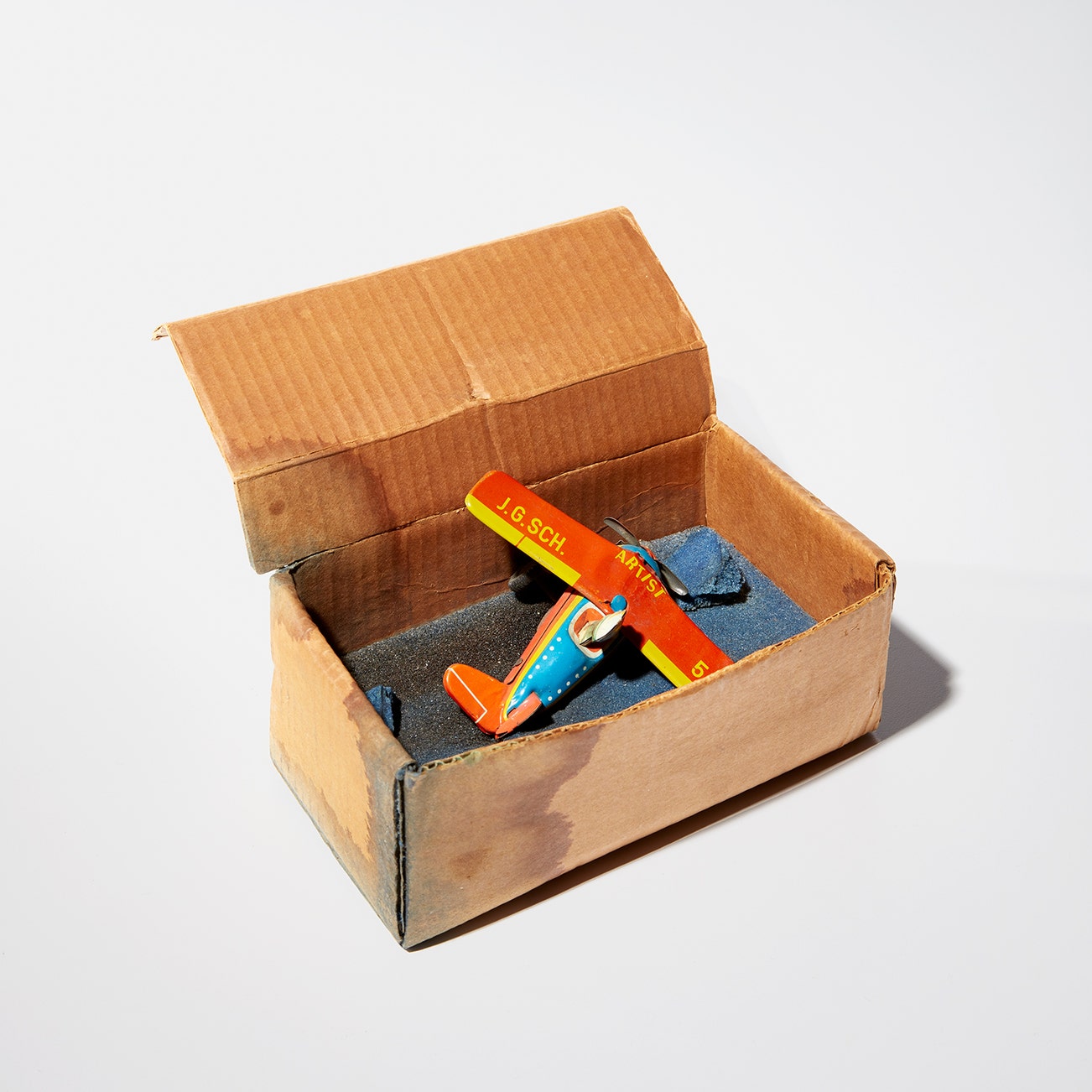 Sheet metal toy airplane and cast sugar with blue acrylic paint, and cardboard box multiple.
