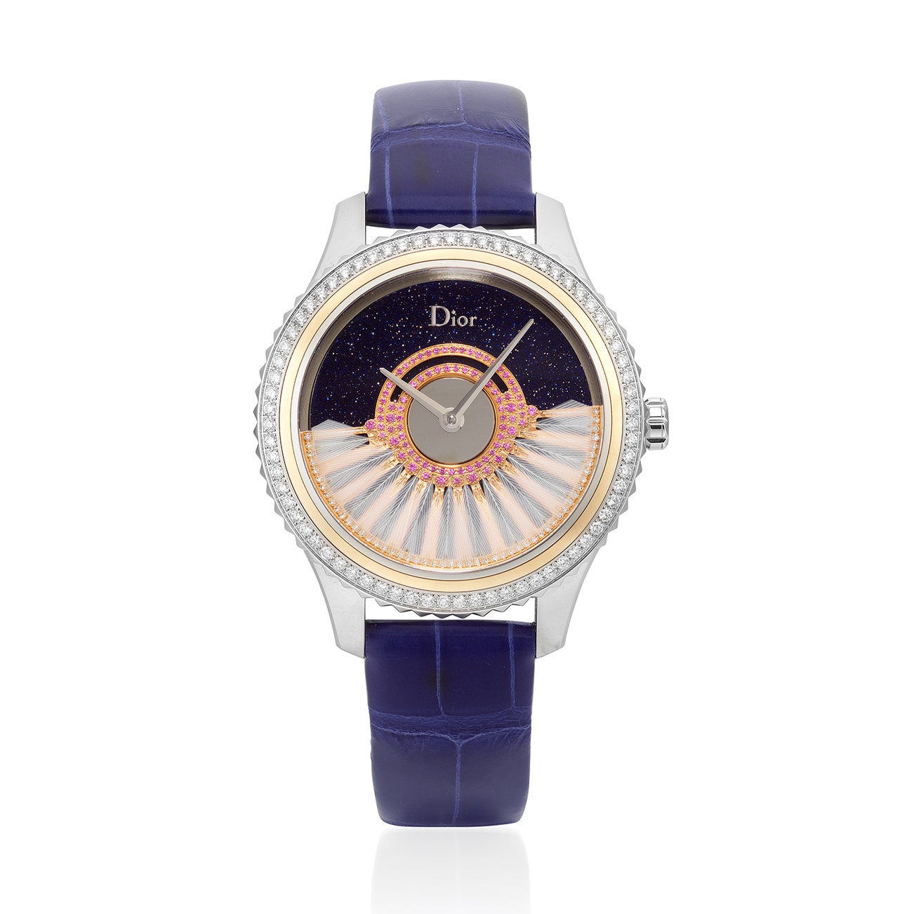 With automatic movement, glittering blue dial, with pink gold oscillating weight decorated with circular-cut pink sapphires, diamonds and white feathers, in a round case with diamond-set bezel and glazed back, joined by Dior alligator strap, mounted in stainless steel, dial and buckle signed Dior, numbered, case width approximately 36 mm.