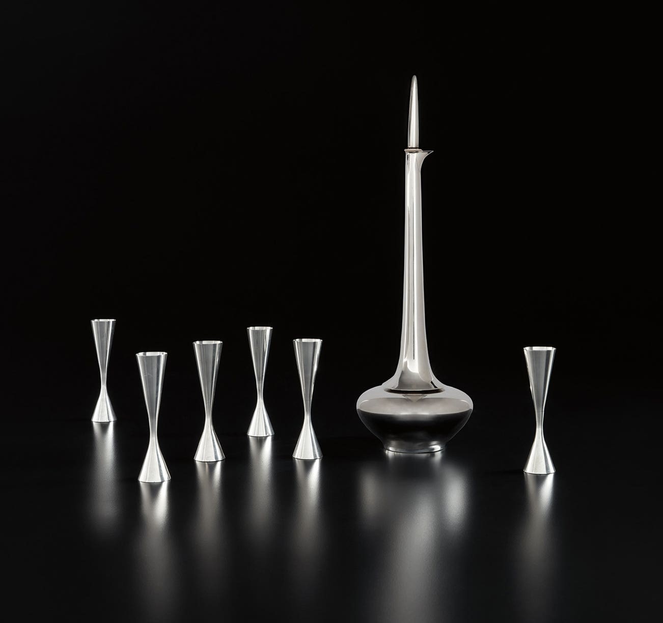 Though the present lot belongs to a line of silver hollowware called “Circa ’70,” Donald Colflesh designed the pieces for Gorham Manufacturing Company more than a decade earlier. This title alludes to the futurism of his forms. The sleek lines of the slender decanter and the attenuated conical cordials almost look like spaceships, surely an inspiration for the young designer during the “Space Race.” Though the aesthetics of the present lot reflect a particular zeitgeist, the forms have remained strikingly modern. Just as a 1961 advertisement in The New Yorker predicted: “An inspiring design, this modern sterling has a timeless quality that makes it a joy to own today, tomorrow, forever." The “Circa ‘70” line also included a tea and coffee set, but the decanter and cordial glass are rarer examples of the “Circa ‘70” line. An example of the present model decanter and cordial belong to the permanent collections of the Brooklyn Museum of Art and the Dallas Museum of Art.
