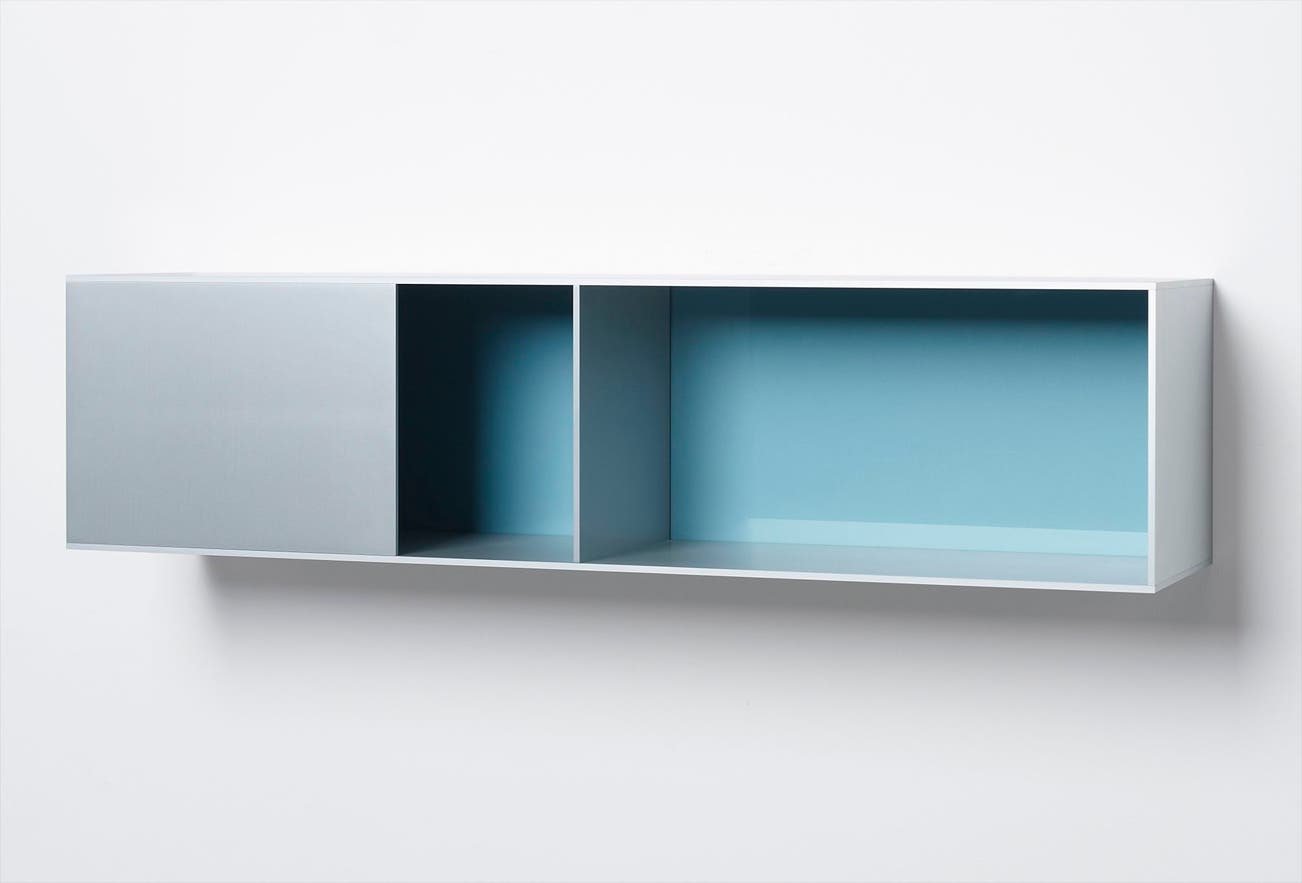 Space and colour, working both together and in isolation, are at the heart of Judd’s oeuvre. In Untitled (91-149 Menziken), he uses industrial materials – tinted Plexiglas and brushed aluminium – to construct a coloured space comprising two unequal rectangular expanses of pale blue within a silvery rectangular frame. The result is a ‘specific object’ – a coherent totality much greater than the sum of its parts, embodying an almost metaphysical relationship between its elements of space and colour, metal and plastic. Judd, noted for his ability to divide forms, further heightens the tension between the open and closed volumes with the inclusion of an enclosed, partly hidden space –a motif he has often returned to. Through this resonant play on negative and positive, Judd produces space that is “intrinsically more powerful and specific than paint on a flat surface” (Judd, ‘Specific Objects’, 1964).