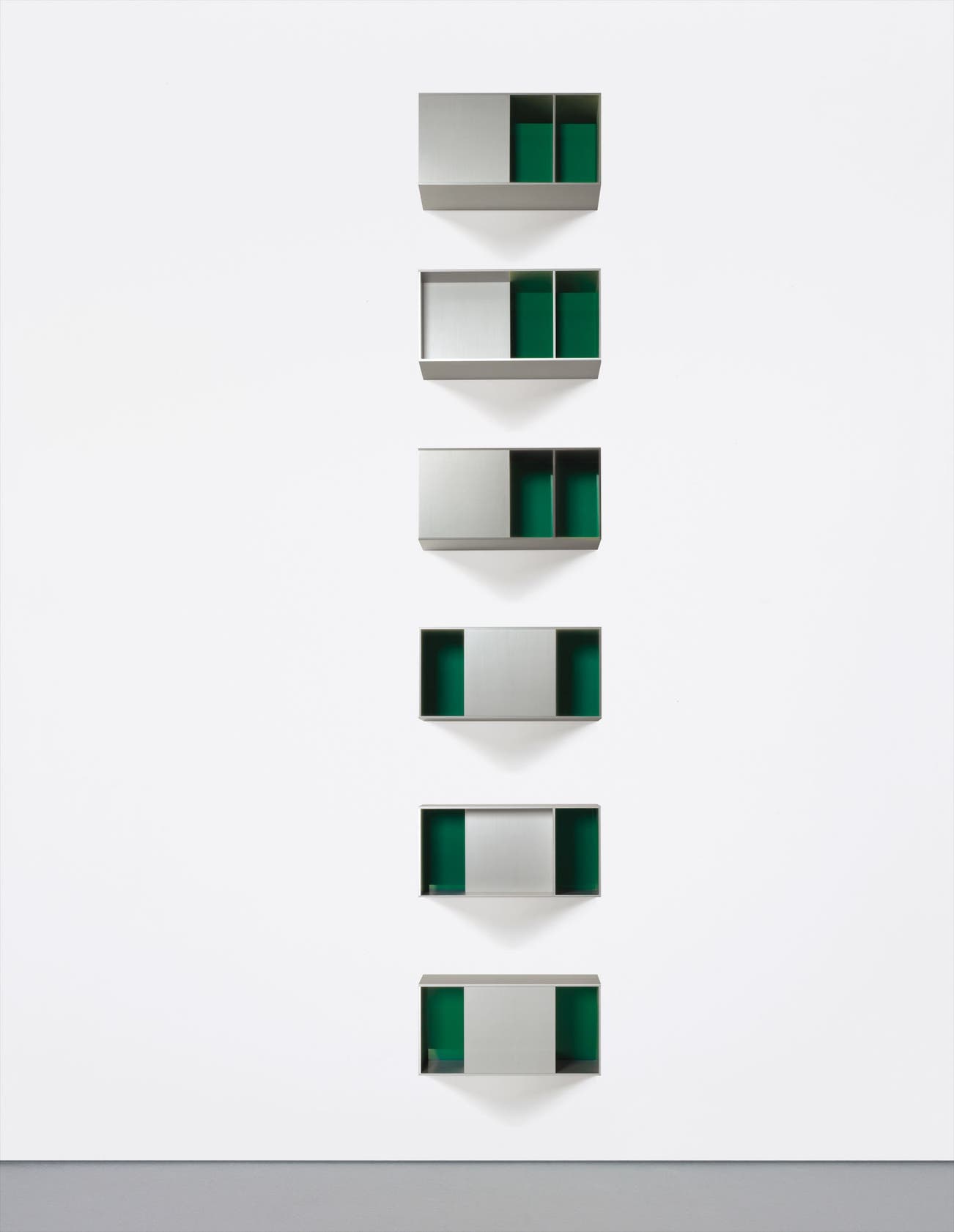 While this contrast highlights Judd’s career progression in his materials, it pales in comparison to his advances in exploring the inner life of his creations. The present lot, in its six-unit formation, provides a different experience for the viewer in each individual unit. The top three units, though identical in their three-part partitioning, feature a variation in the placement of their internal walling. While the top unit possesses green Plexiglas at the back of its right two chambers, allowing a minimal amount of colored reflection, the second unit from top inverts this walled relationship, as the Plexiglas is featured at the front of the right two chambers and the left chamber remains hollow. Positioned above a unit identical to the top unit, the second object from top creates an inverted effect from its counterparts, encouraging the viewer to explore the differences between the two types of Judd’s top unit.