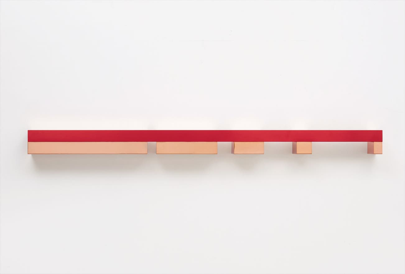 The ability of Untitled, 1979 to employ its audience’s mind is a myriad of efforts coalescing, but no two are more integral than that of form and color. Indeed the repetition of form cannot solely support the massive concepts purported by the work-the brush between methodical organization and luscious coloration represents a critical element in the artist’s oeuvre, elegantly conspicuous in the present lot. The anodized aluminum radiates from its red hue and the brass glows golden, but when the two elements are so tightly juxtaposed, their reciprocity propels them to illuminate color fields that are stellar and impossible to replicate when operating independently. Though the color is mechanically fabricated, it materializes as gently lit by the sun’s rays, and it is returned to its rightful range amidst the ready-made and organic spectrum found in nature. The synthesis of the intense hues impresses upon its viewer the artist’s intimate engagement with color and his charge to invert the painterly myth. Color is born of a planar objectivity in the present lot, and Judd’s deliberate choice of cadmium red is markedly instrumental in the definition of space. Of the color cadmium red, the artist has said, “I like the quality of cadmium red light...If you paint something black or any dark color, you can't tell what its edges are like. If you paint it white, it seems small and purist. And red, other than a gray of that value, seems to be the only color that really makes an object sharp and defines its contours and angles." (J. Coplans, “An Interview with Don Judd,” Artforum, vol. 9:10, June 1971, p. 43) As with Judd’s other sculptures, the work is a miniature concatenation, flourishing and thriving as it stretches earnestly along the wall.