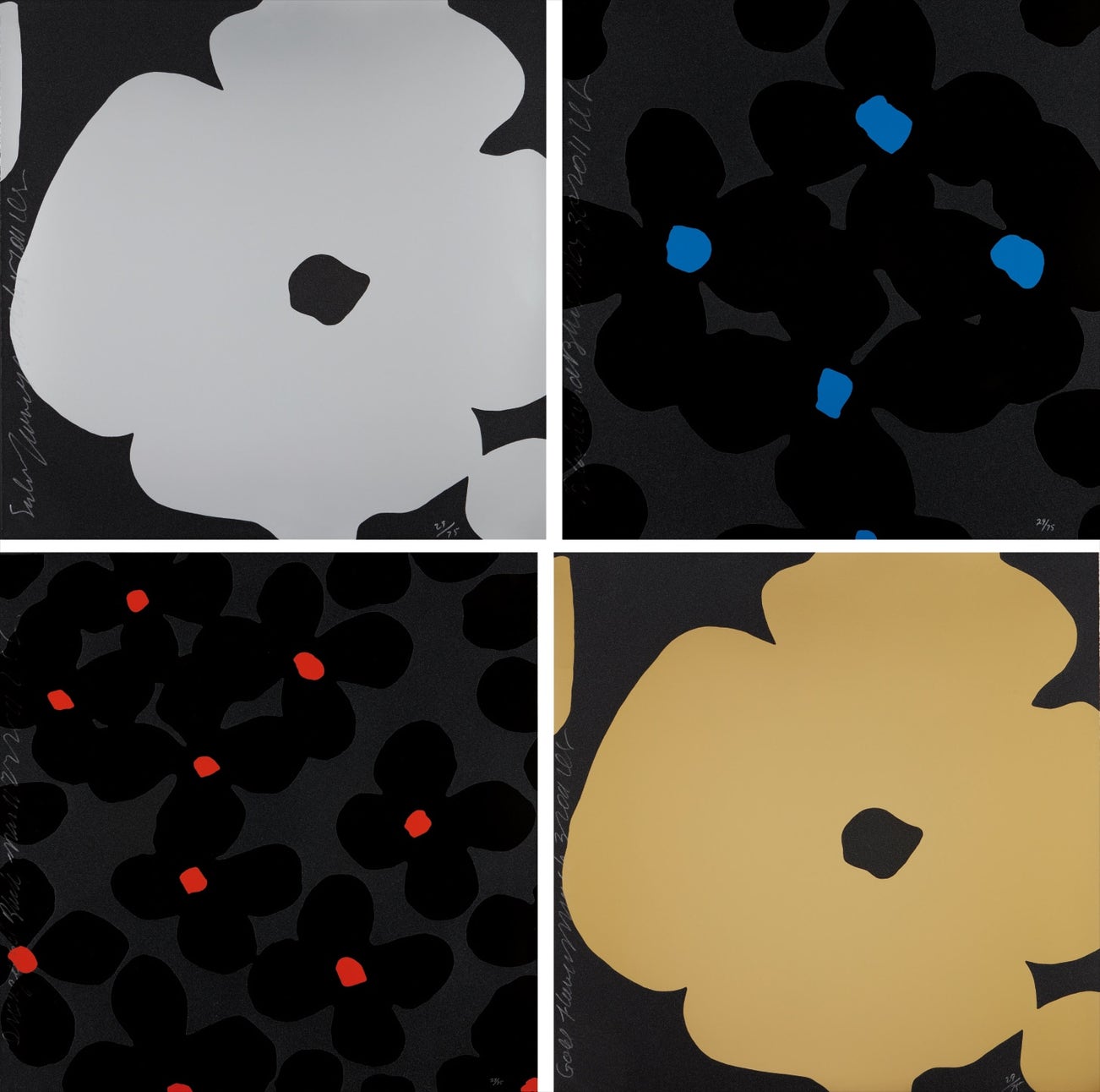 Silver Flowers; Gold Flowers; Black and Blue; and Orange and Black