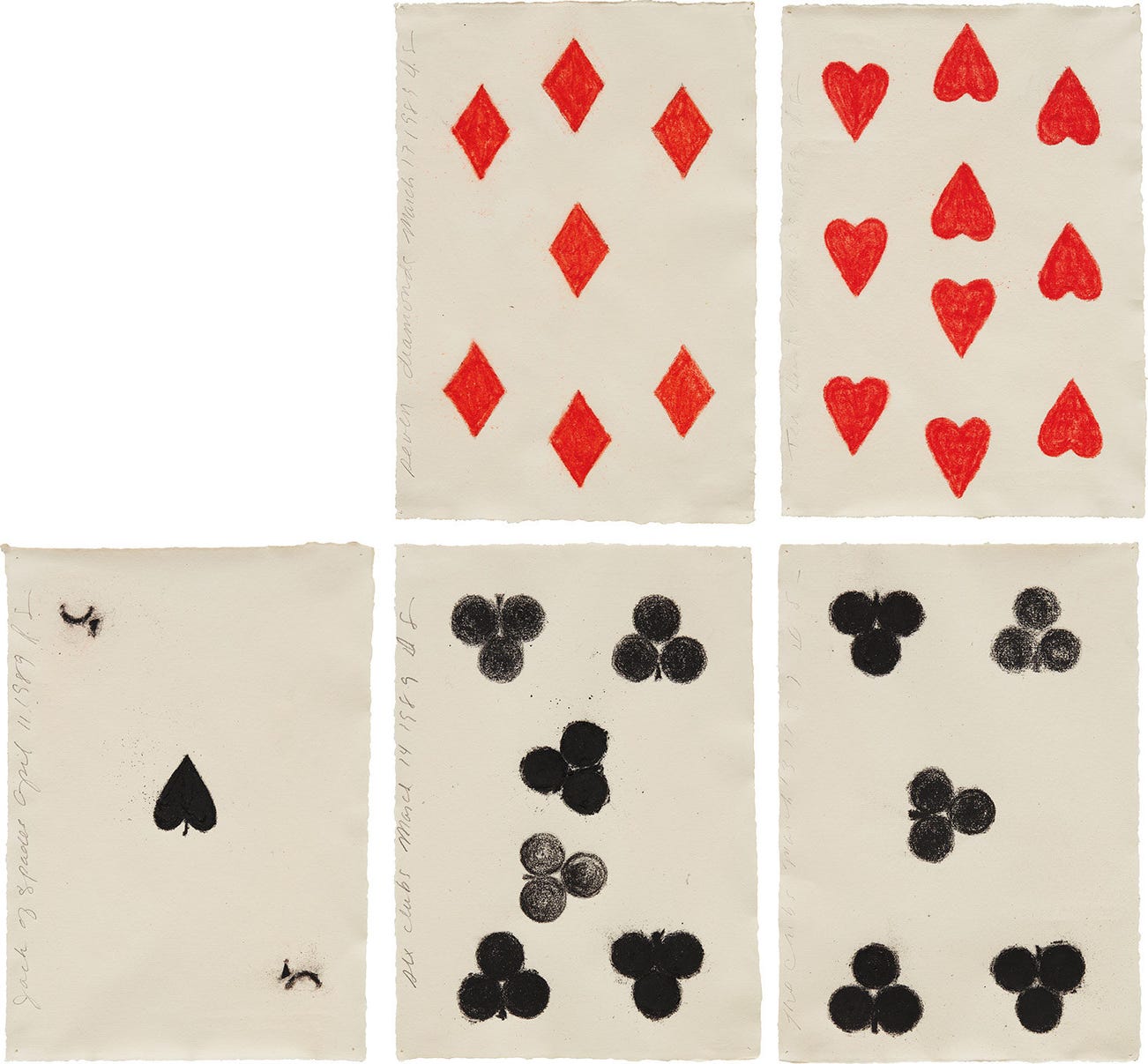 Seven Diamonds March 17 1989; Ten Hearts March 23 1989; Jack of Spades April 11 1989; Six Clubs March 14; and Five Clubs March 13