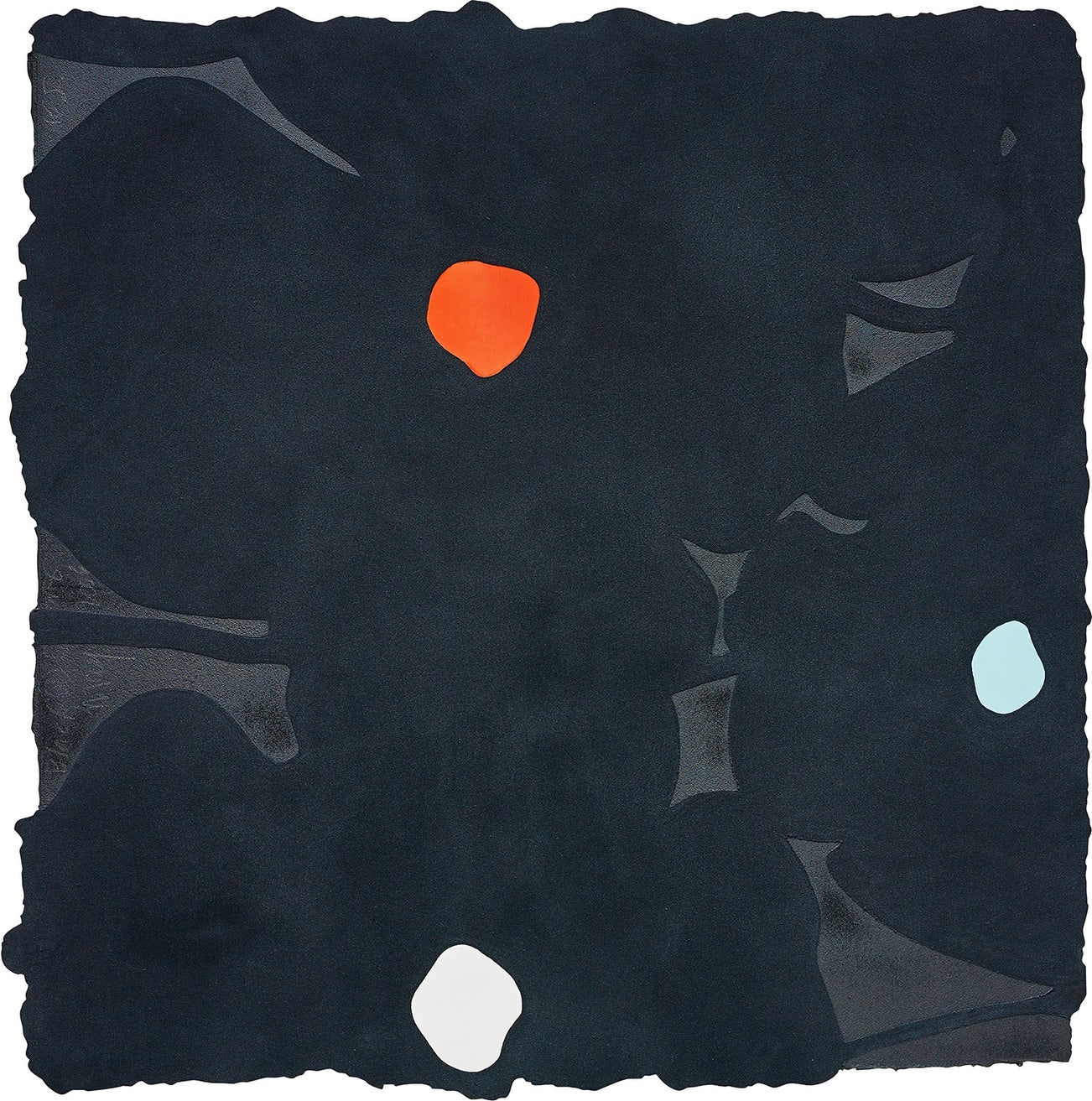 Both structural and painterly, Black with Colors from Donald Sultan’s acclaimed body of work traverses the line between abstraction and representation. Often constructed from industrial materials, such as spackle, tar, linoleum and flocking, Sultan developed his unique use of medium through his early work as a theatre set-builder. The artist's recognisable aesthetic is encapsulated through the artist’s close cropping and richly textured renderings of familiar natural subjects, most notably lemons, poppies, pomegranates and tulips. These organic motifs are transported from traditional floral depictions seen in historical still life painting and are re-imagined in the artist’s enlarged square-format compositions, their form defined through Sultan’s use of large planes of black pigment and flocking. With its lustrous surface quality, Black with Colors subsumes the viewer’s gaze with its subtle surface variations, creating areas of light and shade with vibrant bursts of saturated pigments, evoking a warm summer palette.