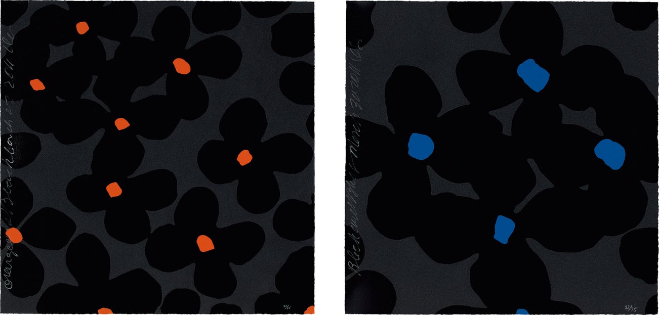 Two screenprints with hand-applied silica in colors, on 2-ply museum board, the full sheets.