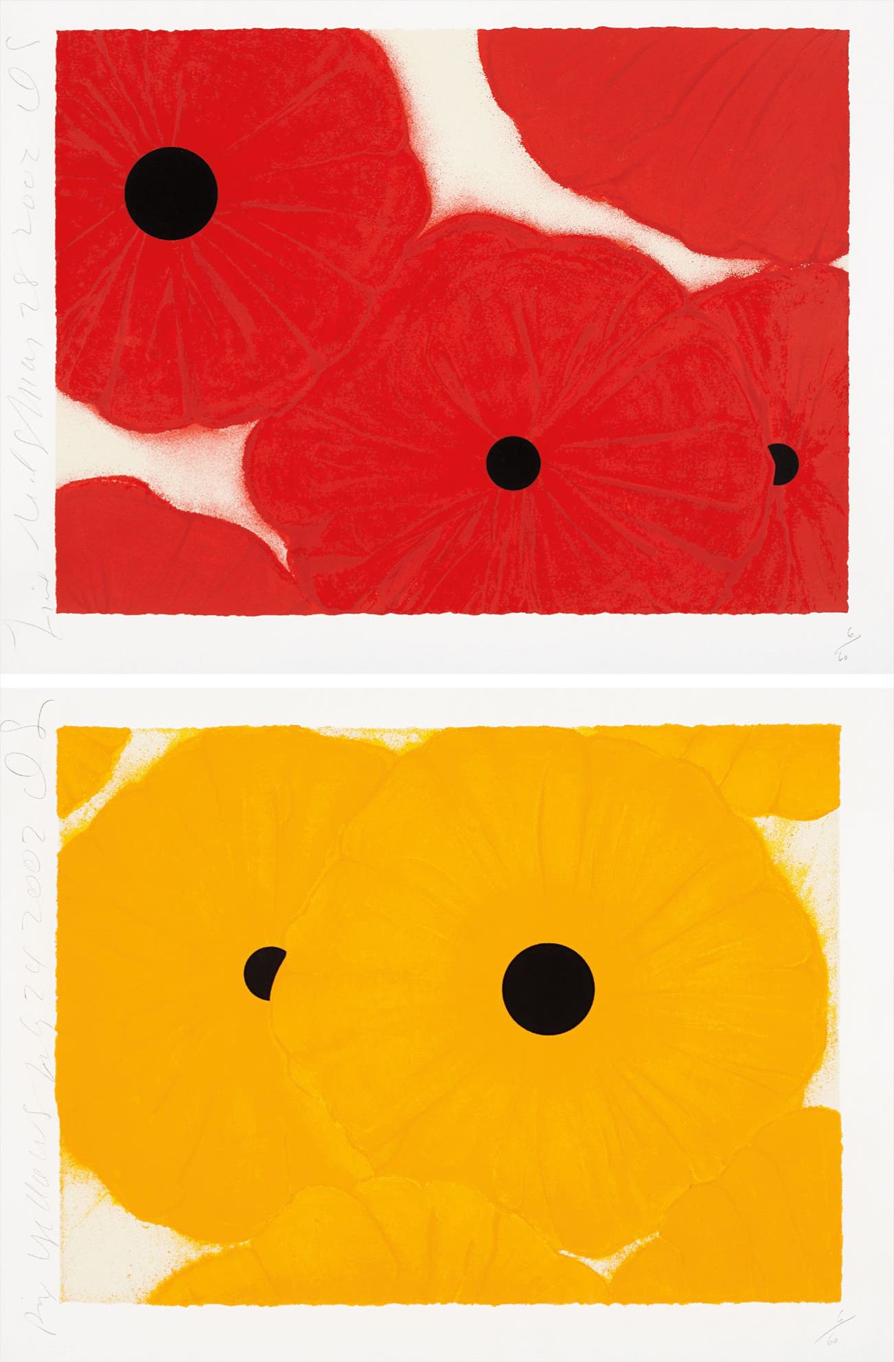 Two screenprints in color with flocking, on Somerset paper, with full margins,