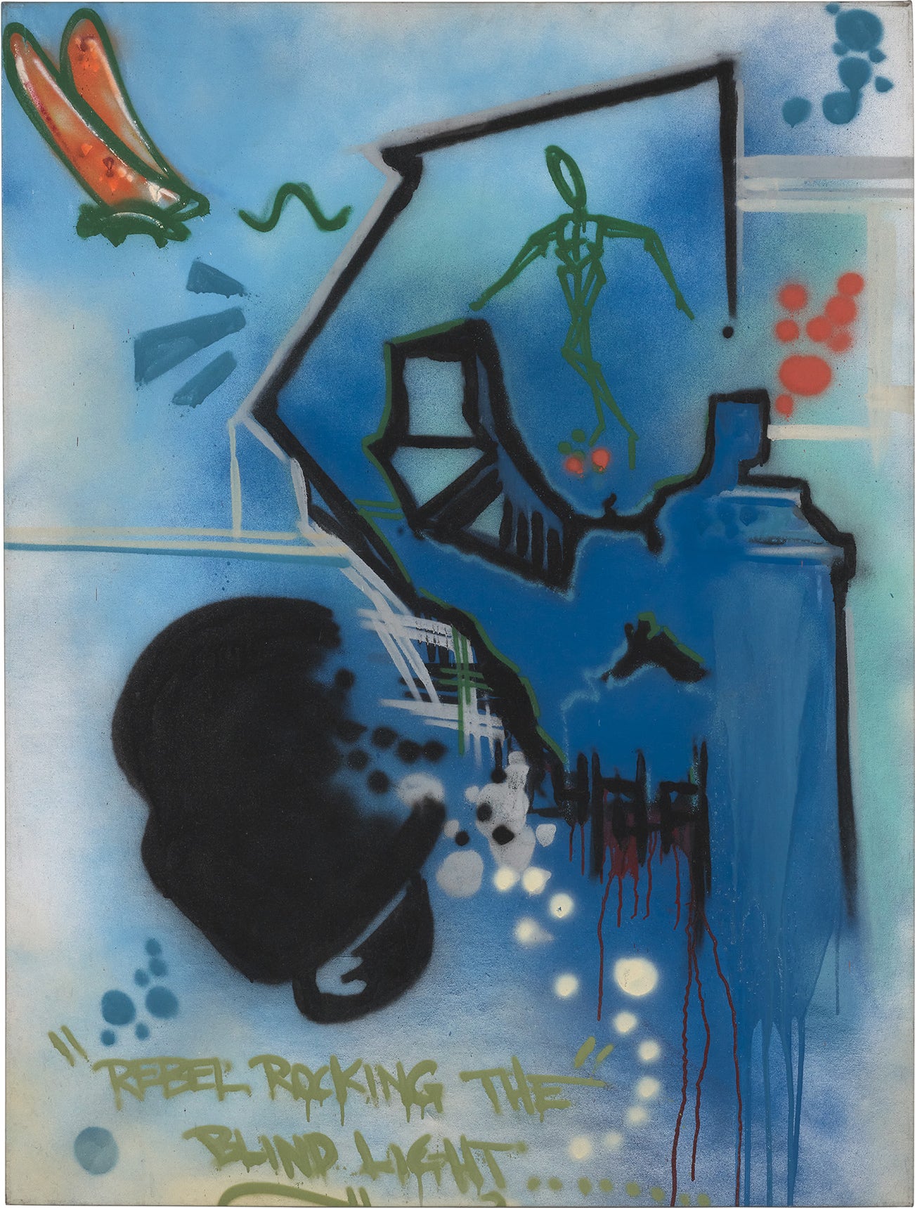 titled ""REBEL ROCKING THE" BLIND LIGHT........" lower center; signed, titled and dated ""★ Dondi White" 1983.© Rebel RockinG... Rebel Rocking..." on the reverse