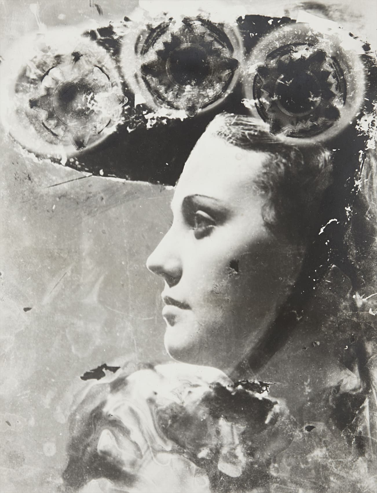 While Profile Picture with Glasses and Hat is not dated, most likely it was created at the tail end of Maar’s photographic oeuvre in the late 1930s. It was during those final years that Maar’s work became more experimental, at times scratching, manipulating or painting over her negatives. In another, possibly earlier variant of the image, Maar is seen with an oversized hat presumably painted over her head. That variant is markedly darker and less worked-over than the print offered in the current lot, which presents a higher level of contrast, more extensive level of manipulation to the negative, and the addition of three glasses crowning Maar’s head. Interestingly, the image bears similarity to a few similarly-sized gelatin silver prints taken in 1936-1937 by Pablo Picasso of Maar. Indeed, Maar’s Profile Picture with Glasses and Hat appears to echo some visual nuances found in Picasso’s portraits of her: the swirly background, the high level of contrast, the profiled pose, the wide-open eye, and the triple-oculi motif partially covering Maar’s head. Profile Picture with Glasses and Hat, therefore, in addition to providing a glimpse of Maar’s beguiling interior world, may also be a glimpse of an artistic dialogue with her famous lover.