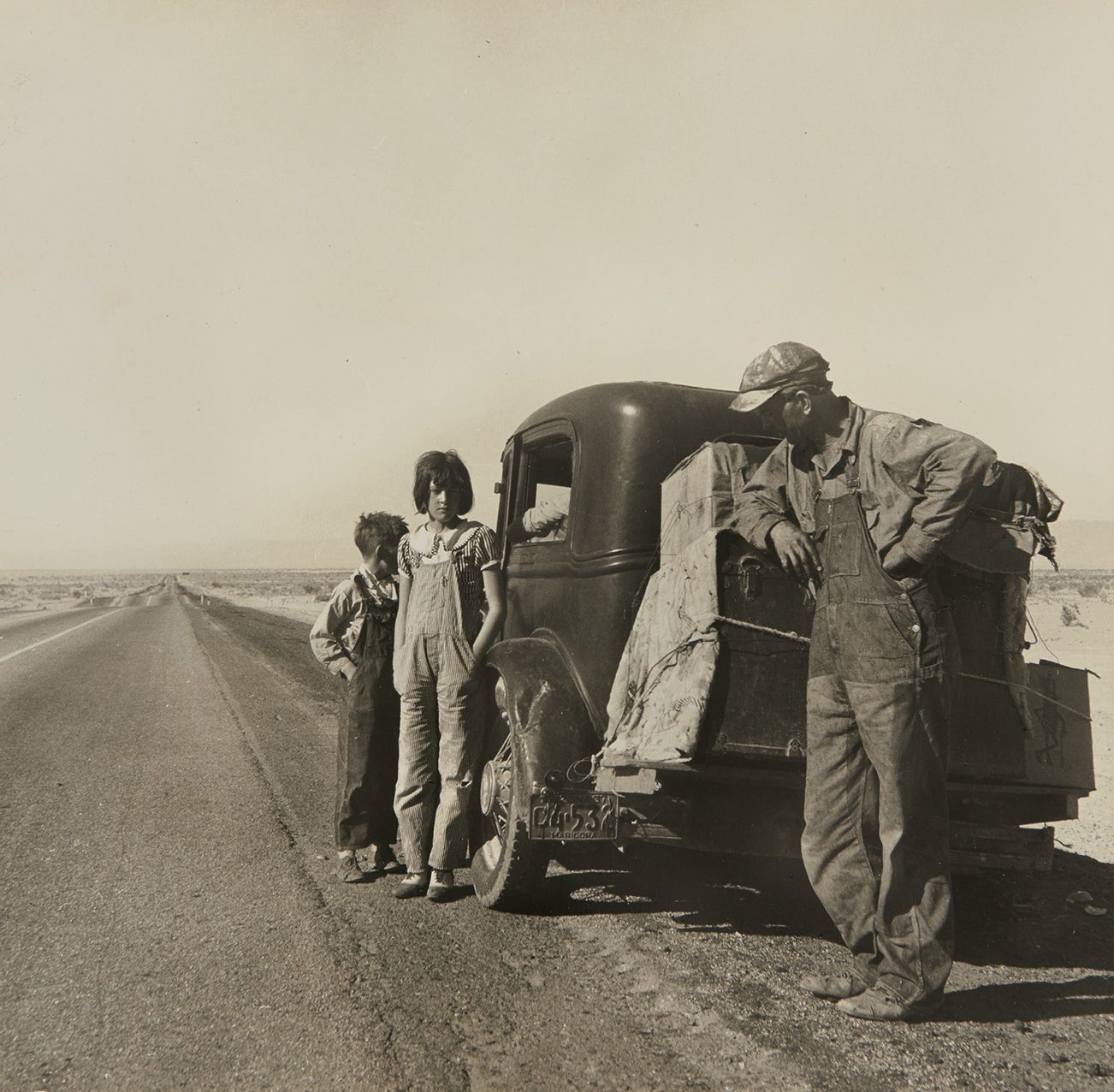 Oklahoma Sharecropper and Family Entering California. Stalled on the Desert Near Indio, California
