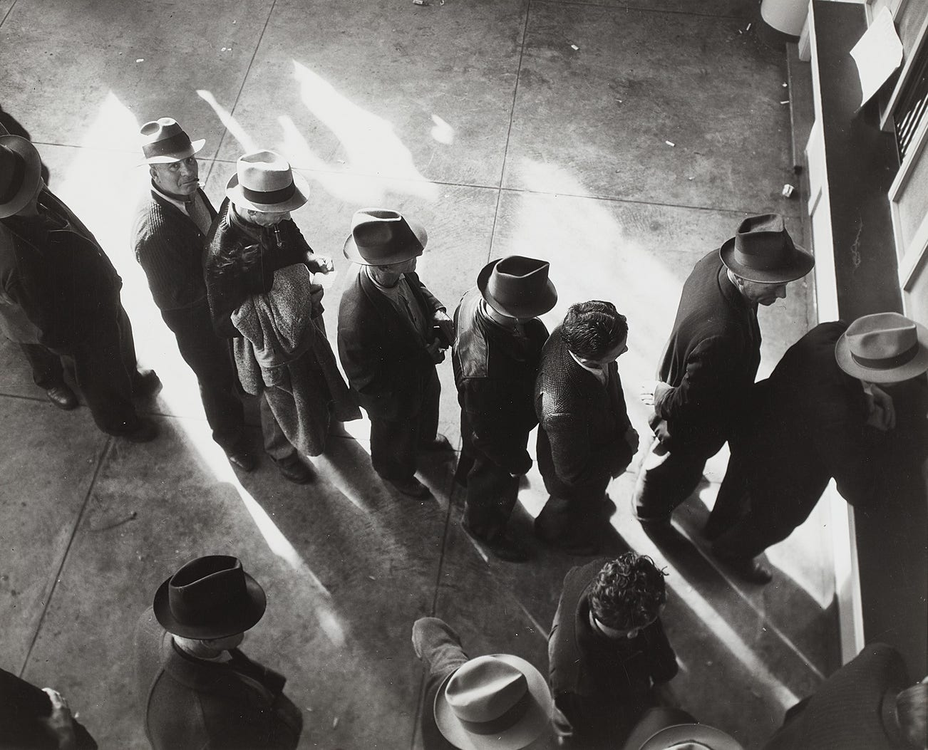 The Library of Congress caption for this photograph reads: 'Unemployment benefits aid begins. Line of men inside a division office of the State Employment Service office at San Francisco, California, waiting to register for benefits for one of the first days the office was open. They will receive from six to fifteen dollars per week for up to sixteen weeks. Coincidental with the announcement that the federal unemployment census showed close to ten million persons out of work, twenty-two states begin paying unemployment compensation.’