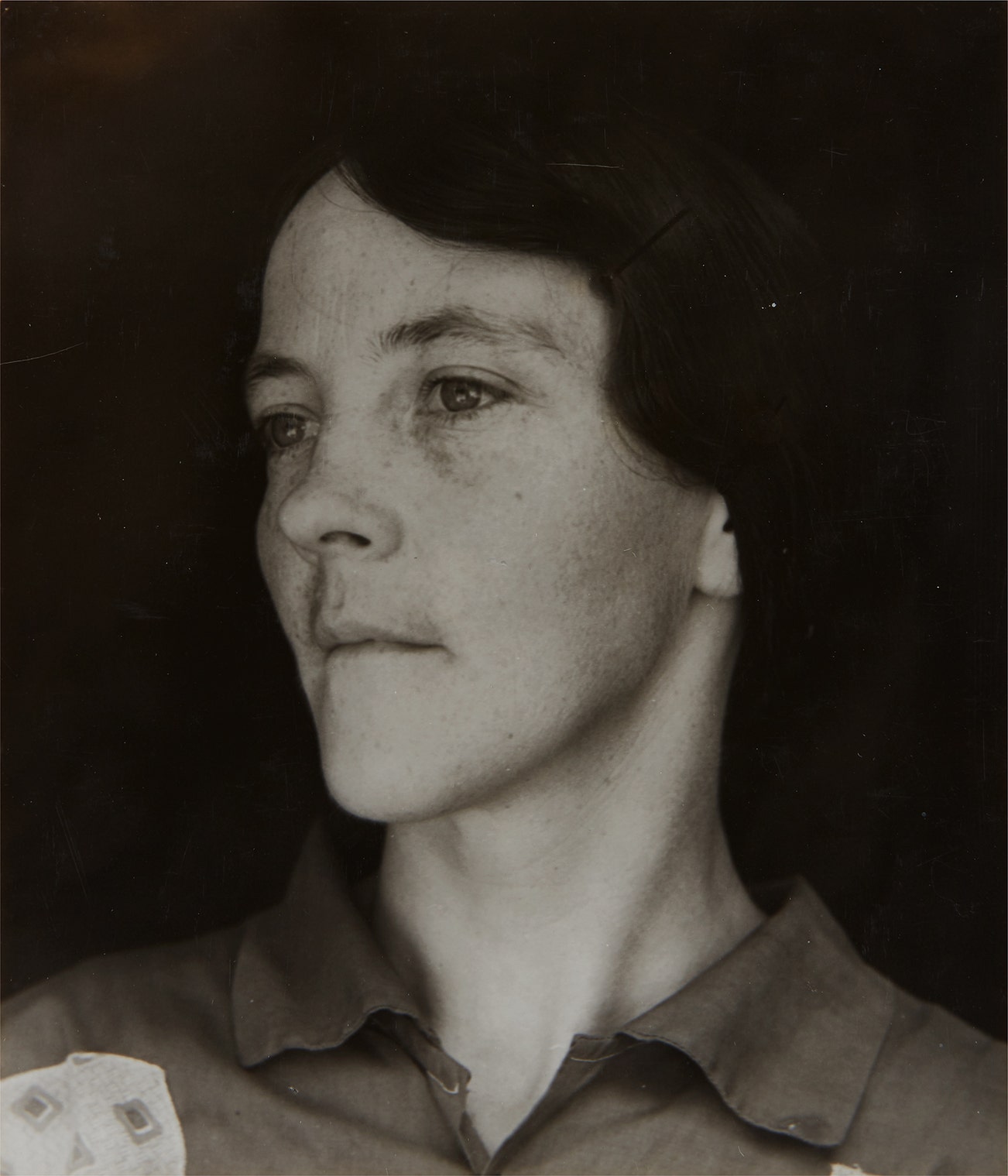 'Dorothea Lange: The Human Face' exhibition label and a family collection stamp on the mat backing-board.