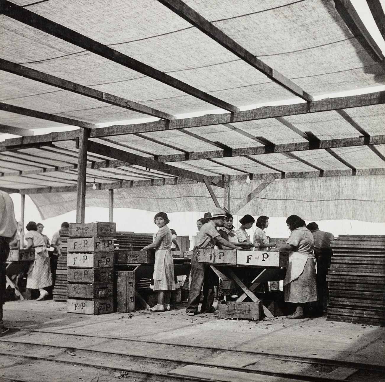 The full caption on the label on the reverse of this print reads: 'Women packing apricots in large open sheds adjoining the orchards. Brentwood, California. January, 1938.'