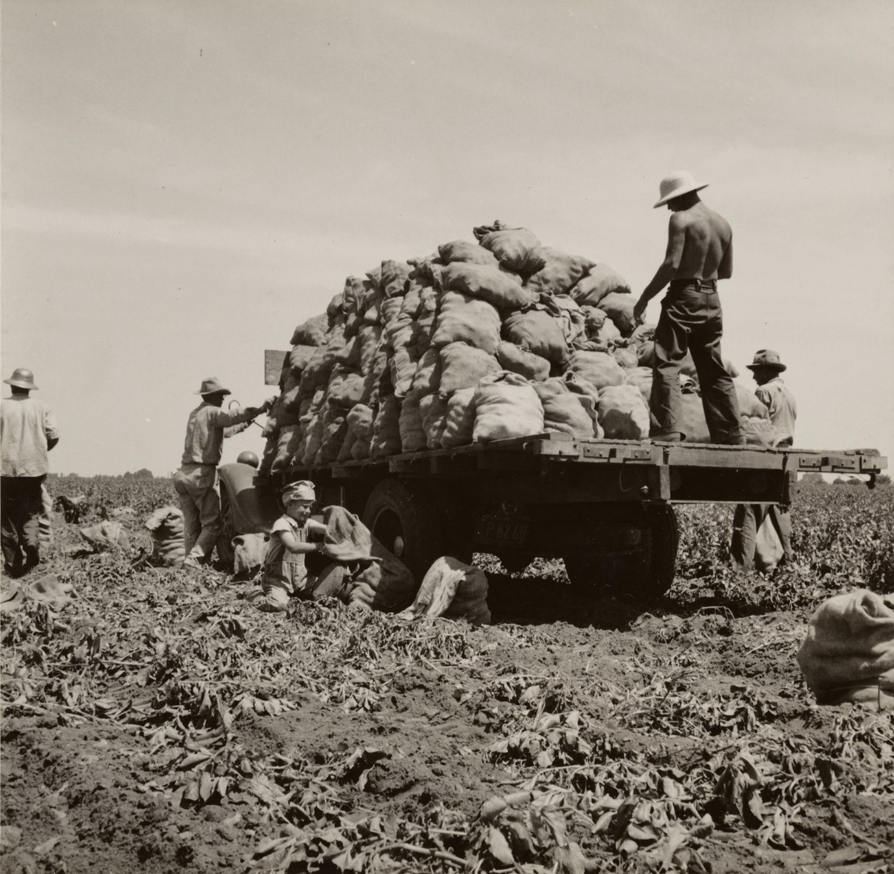 The full caption on the label on the reverse of this print reads: 'Truck being loaded as it goes down the rows. The pickers pick the potatoes from the ground and put them in the sack which is suspended from their waists between their knees - after the machine has dug them from the ground. This work requires endurance but no special skill. 1937 wages - 40¢ an hour. Shafter, California. May, 1937.'