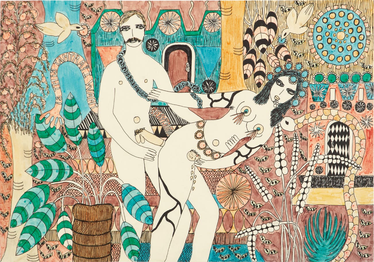 Ink and marker drawing in colors on wove paper.