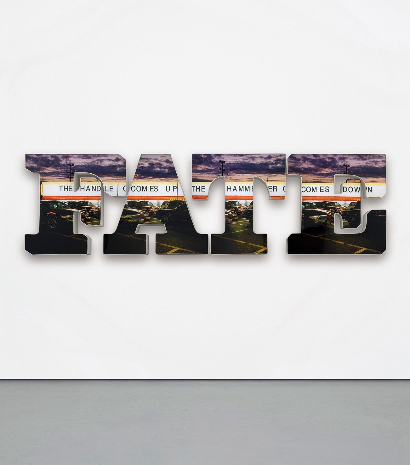 Doug Aitken explores the complex themes of time and space in his work the handle comes up, the hammer comes down. Created in 2009, this work was included in the artist’s debut exhibition on the West Coast at Regen Projects, which showcased a body of work that contemplated the haunting truths of migration and industrialization. With a conceptual focus on the present, combined with a futuristic aesthetic, the exhibition consisted of imposing wall installations, such as the present lot, that create a narrative encouraging viewers to experience their own individual story. Initially, the LED-lit word “FATE” speaks loudly and directly to its viewers, drawing their attention. Once engaged with the work, one will focus more intimately on the displayed landscape of a sunset over a lifeless parking lot.