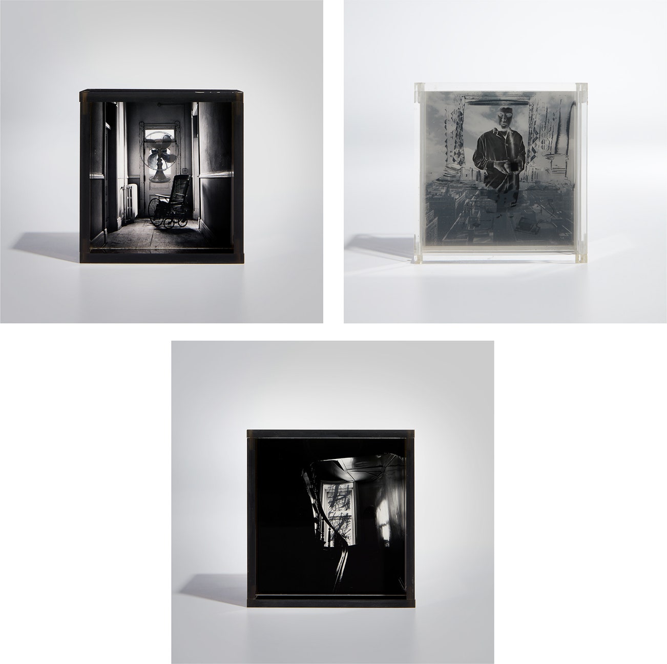 Three photographic sculptures, each a composite of layered transparencies enclosed within a plexiglass box.