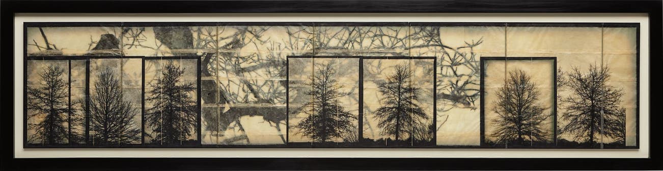 Since their teenage years, identical twins Doug & Mike Starn have used their art as a means of exploring the physical and intellectual world around them. As conceptual artists using photography as their primary medium, they incorporate elements of sculpture, installation, video and architecture in their practice, resulting in a body of work that defies classification and simplistic analysis. In the Structure of Thought series (lots 12 and 239), the Starn brothers explore the sun and its power as a source of light and the life that it gives by photographing one of nature’s grandest forms- trees - in silhouette, their branches weaving together to create a web of interconnectivity. Working with various translucent papers on which each of the photographs are printed- here Thai mulberry, gampi and tissue paper- the photographs are then intricately layered together with encaustic, wax and varnish to create a tableau that fosters a dialogue between the tensions that arise from within, at once light and dark, delicate and monumental, individual and connected.