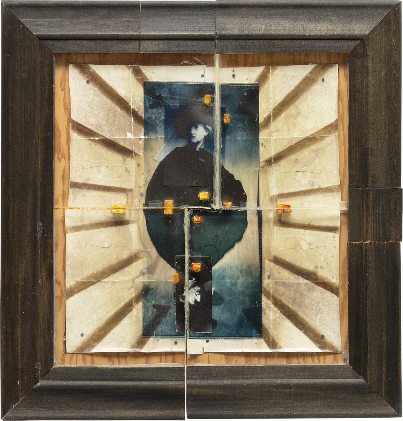 Assemblage of toned silver gelatin and Kodalith prints, with plywood, painted metal nails, tape, and glue, contained in the original artist-specified frame, in two parts.