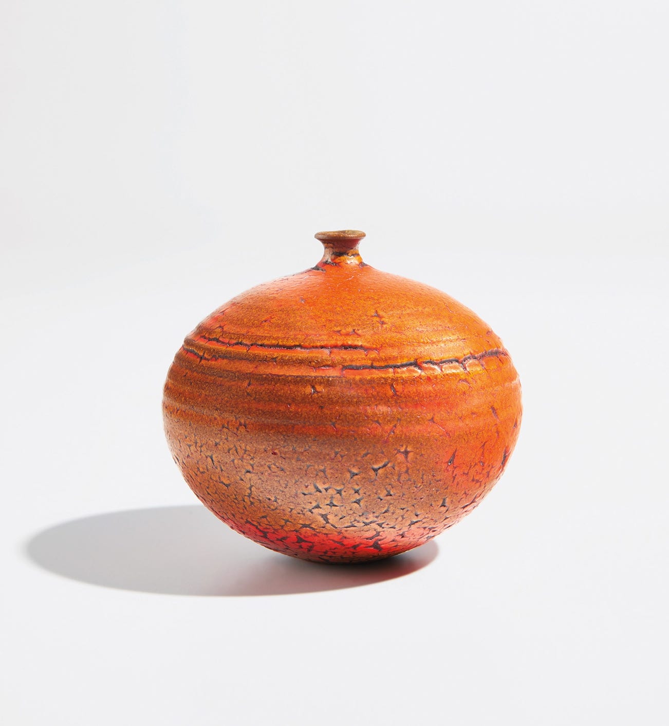 With training from California ceramic luminaries Glen Lukens, F. Carlton Ball and Vivika Heino, and a background as a glaze technician for a chemical supply company, Doyle Lane developed a career as a working studio ceramist in Los Angeles in the middle of the 20th century. Among the hallmarks of his œuvre are his weed pots. The present example, relatively large for this miniaturized body of work, exhibits Lane’s technical mastery of the crawling thick glaze and tightly designed compact form. Lane’s weed pots were often displayed in groupings, the range of scale and colors a visual delight for collectors, and, as with the present lot, individually commanding enough on their own.