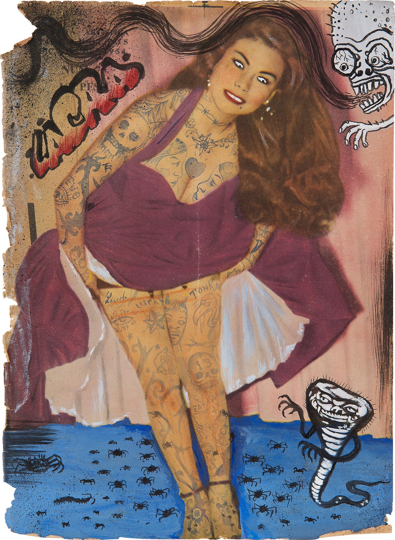ink and gouache on vintage magazine page