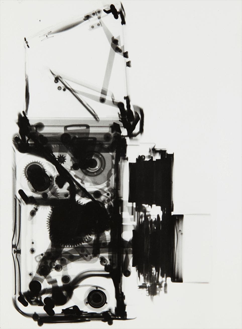 This gorgeous x-ray photograph of the inner workings of a Rolleiflex Camera, a camera championed by photographers such as Diane Arbus, was created by the nuclear physicist, Dr. Paul Fries, who headed the industrial x-ray division of Siemens in Erlangen, Germany. Fries had access to one of the few x-ray machines capable of penetrating metal objects which, inspired by the post–war "Subjektive Fotographie" movement headed by Otto Steinert, he used to create a body of exquisite images from 1951-1955 that only the "unseen" light of an x-ray could produce. This is one of only two known prints of this image. The other known print of this image is later, probably late 1950's or early 1960's and smaller in format.